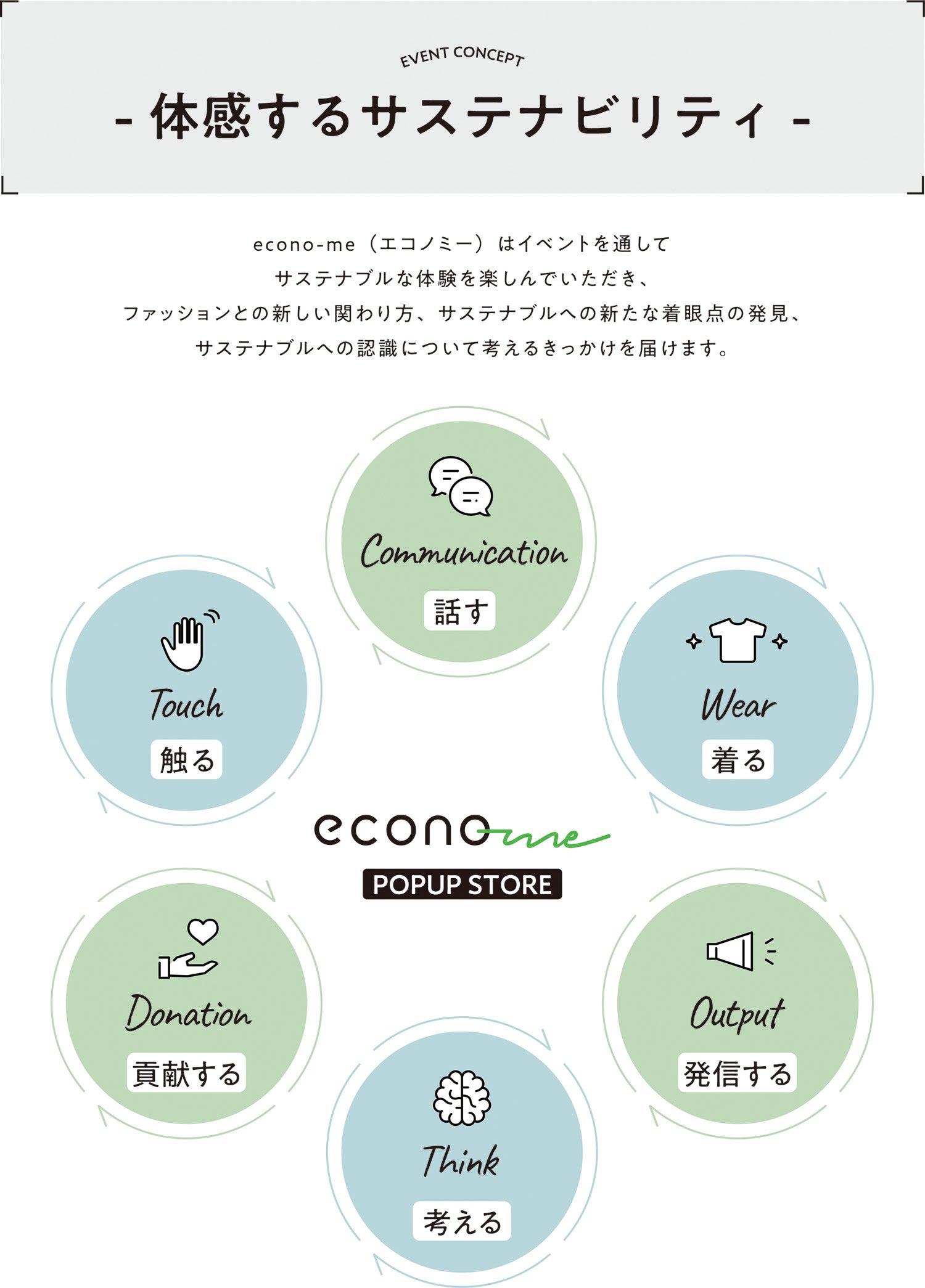イベントでは、これまで「econo-me」で製作したプロダクトの一部を展示・販売。実際に手で触れ着てもらうことで品質や着心地の良さを実感していただけます。また、会場内には古着回収BOXの設置、プロダクト開発に携わったスタッフから素材やこれまでのサステナブルな取り組みを紹介します。直接的な対話を通じてもサステナビリティを体感してもらうことができます。