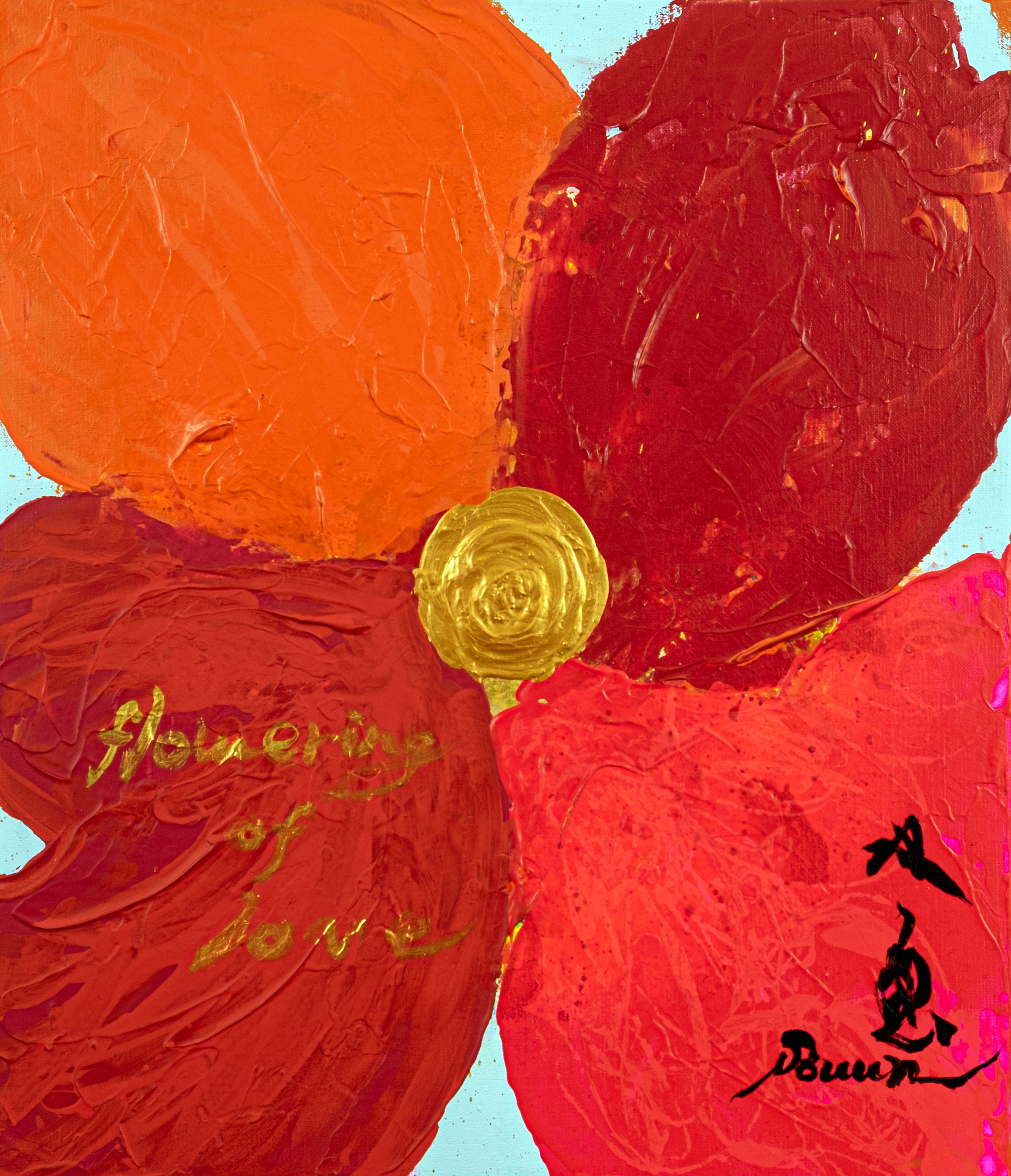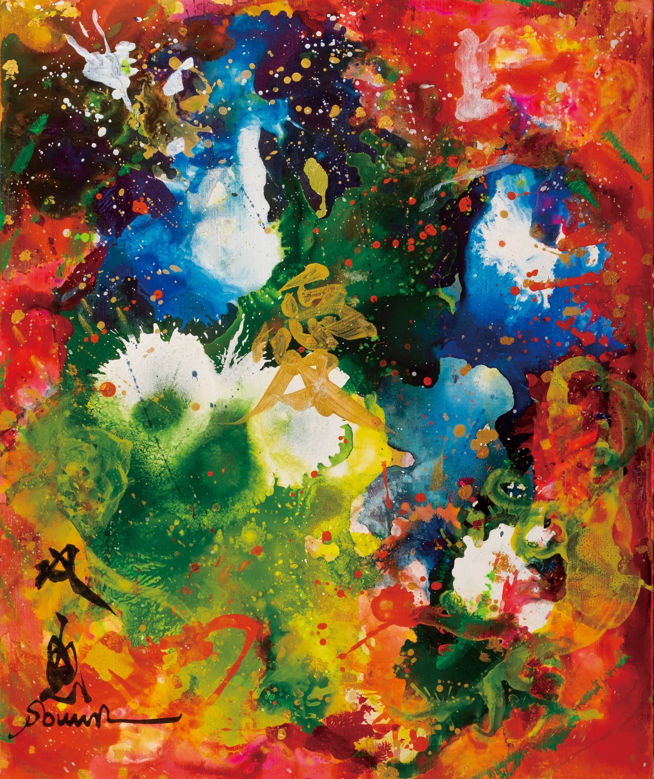 今回の個展では、この愛という普遍的なテーマに沿って、複数のジャンルにわたる多彩な作品、140点以上を展示・販売。石川県の文化、そしてものづくりを応援したいという想いから、金沢の金箔工芸「箔一」の金箔を使用した箔打ちの緊張感と静謐さが漂う「箔」、1400年の歴史を有する越前和紙を用いた「越前」、大自然や宇宙から着想を得た「アートワークス」など、伝統的な書の作品から色彩鮮やかな現代アート作品まで幅広く展示し、会場内を双雲作品と“愛”で埋め尽くします。