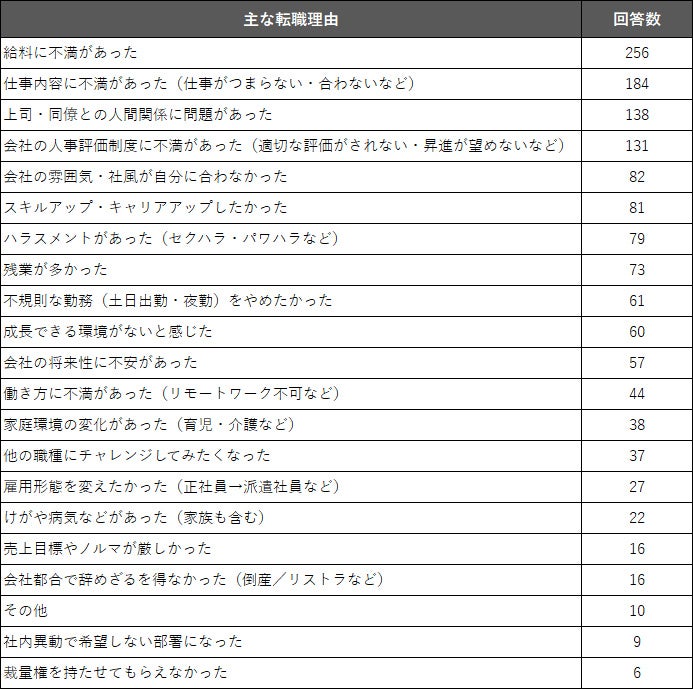 また、「仕事内容に不満があった(184人)」「上司・同僚との人間関係に問題があった(138人)」「会社の人事評価制度に不満があった(131人)」と回答した方も多く、給料面だけではなく、さまざまな理由が転職の引き金になっていると考えられます。
