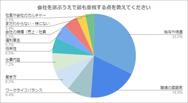 「給与や待遇」が32.2%で最多となり、「職場の雰囲気」19.0%、「ワークライフバランス」9.4%、「働き方」8.2%、「仕事内容」7.2%と続きました。