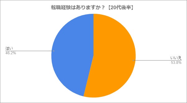 「転職経験がある」と回答した20代は、20代前半(20~25歳)が28.5%、20代後半(26~29歳)が46.2%、全体でみると約4割という結果となりました。