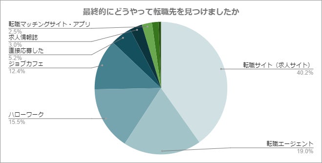 「転職サイト(求人サイト)」と回答した方が40.2%で最多となり、「転職エージェント」が19.0%、「ハローワーク」が15.5%という結果になりました。