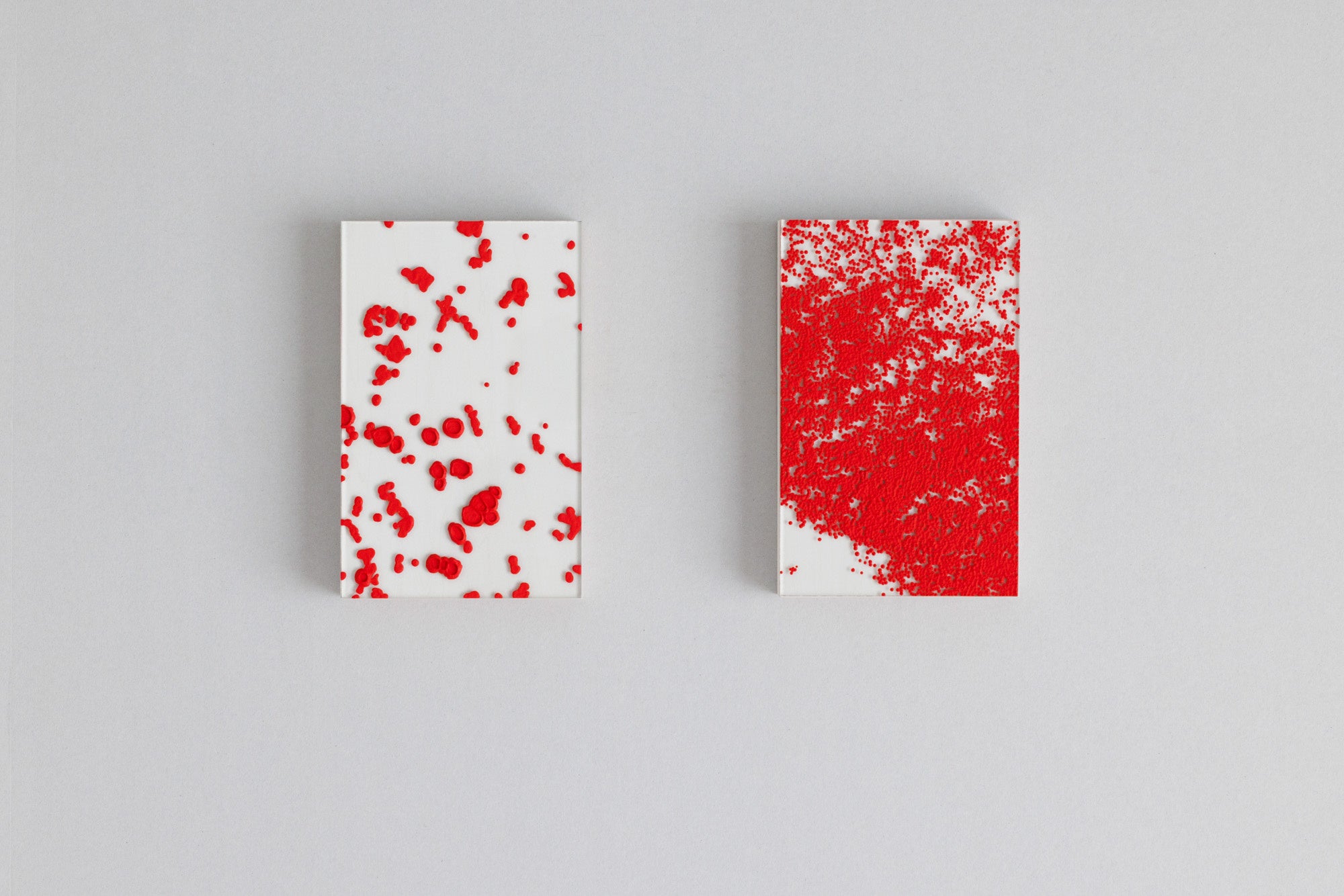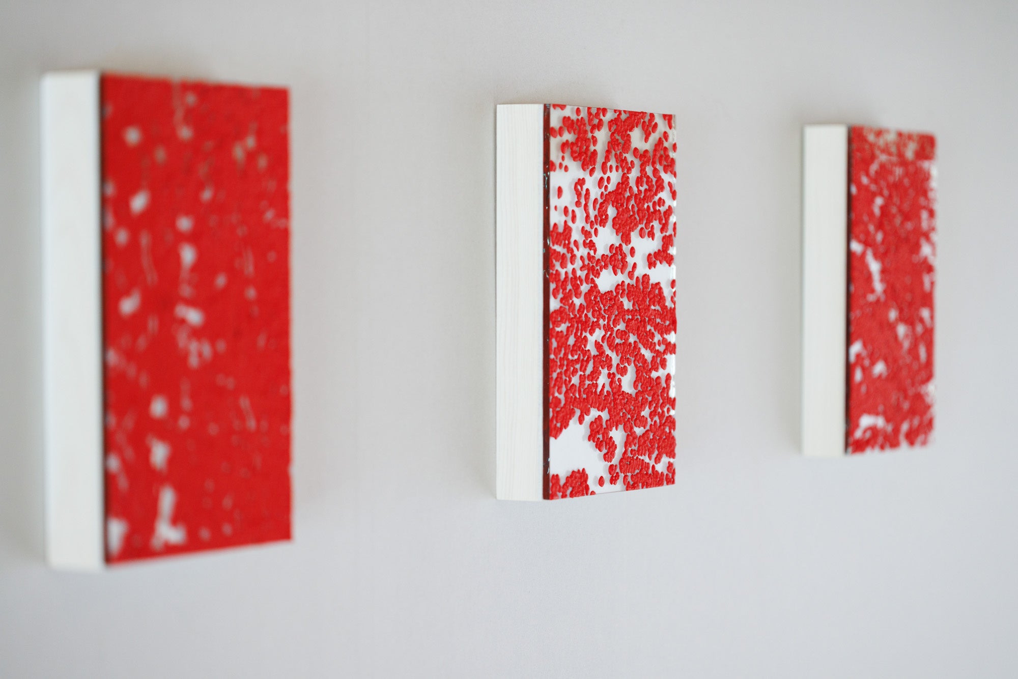 大和美緒は、点や線を繰り返し描くことで、生命の軌跡や物質の摂理を可視化する作品を制作してきたアーティストです。本展で展示される「under my skin」シリーズでは、自身の血液細胞を顕微鏡で観察し、その姿を鮮烈な赤い色彩で描いています。