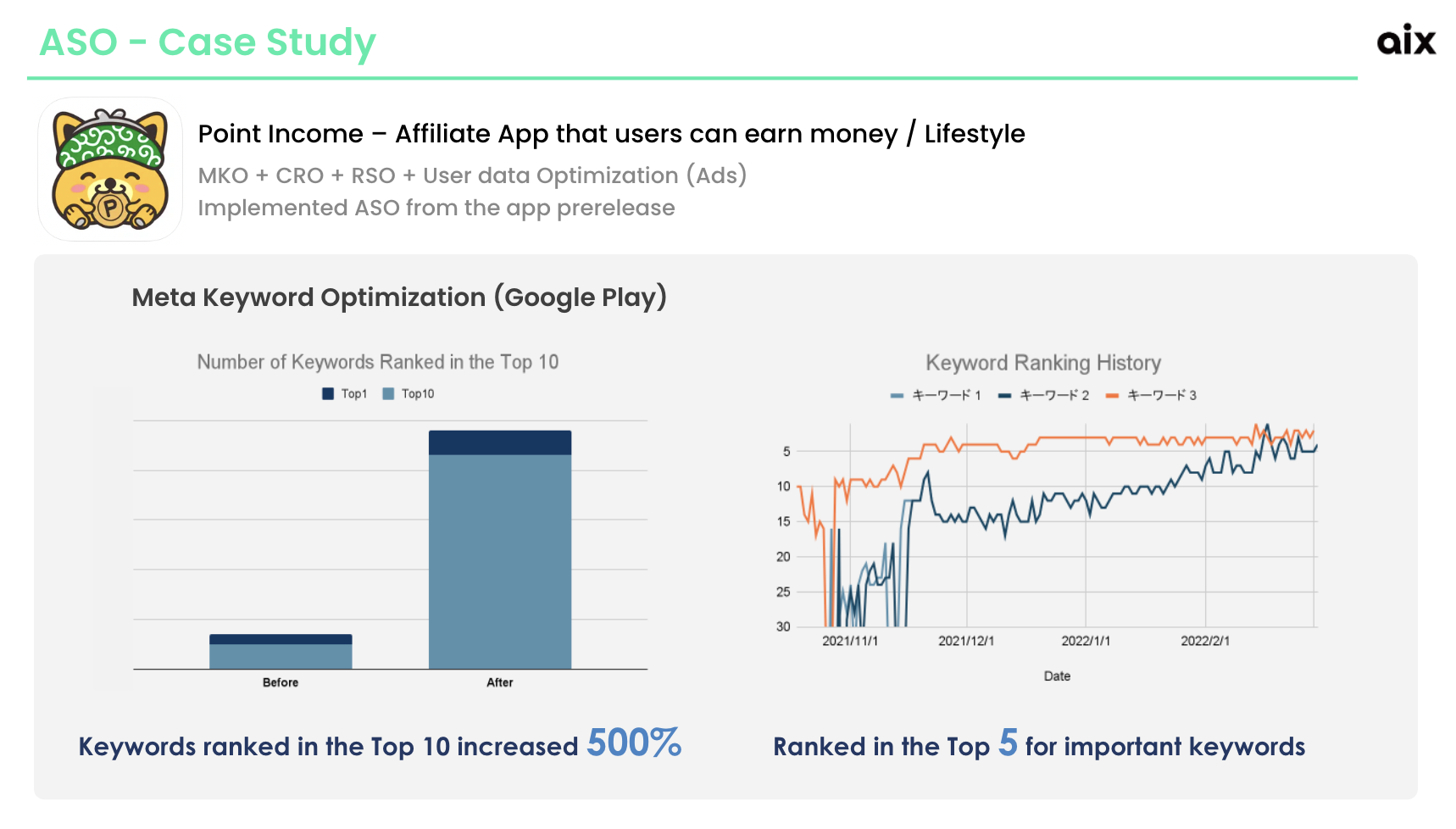 現在、aixは関連会社であるファイブゲート株式会社(代表取締役:山下雅弘)が運用するポイントアプリ「Point Income(ポイントインカム)」のASO施策を行なっております。