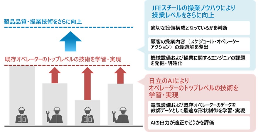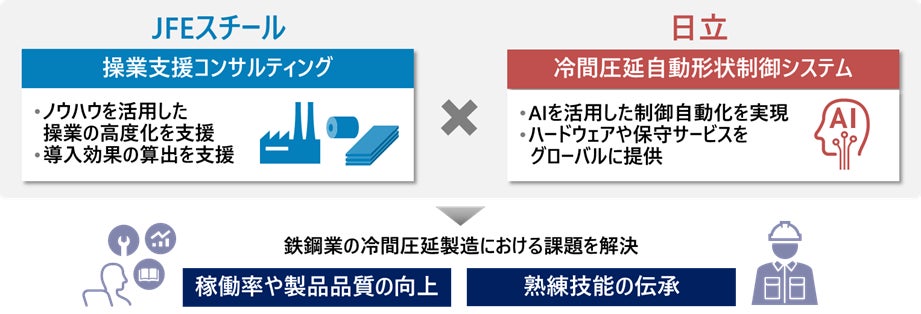 J FEスチール株式会社(以下、「JFEスチール」)と株式会社日立製作所(以下、「日立」)は、JFEスチールのコンサルティングと日立の冷間圧延自動形状制御システムを組み合わせたソリューション(以下、「本ソリューション」)を、国内外の鉄鋼業のお客様向けに本日から提供開始しました。本ソリューションは、人工知能(AI)で圧延機による鋼板の形状補正を自動制御する日立のシステムに、JFEスチールのハイレベルな操業ノウハウを活用したコンサルティング(システム導入、最適操業)をお客様のニーズに応じて組み合わせて提供するものです。