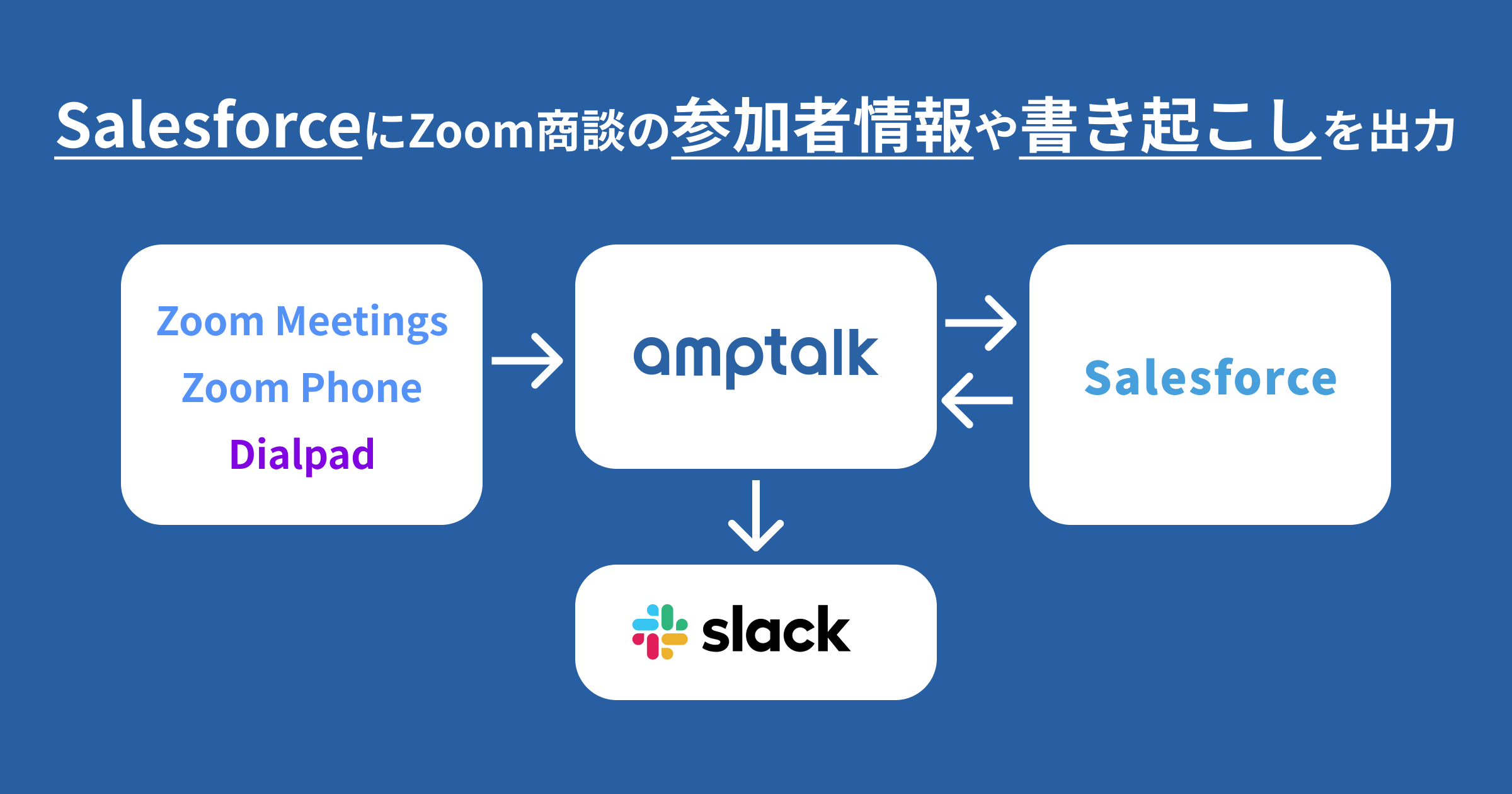 Zoom Meetings(ビデオ会議ツール)やZoom Phone、Dialpad(IP電話)の書き起こしから解析した内容をSalesforceに連携し、Slackへ通知することで業務効率化が可能に