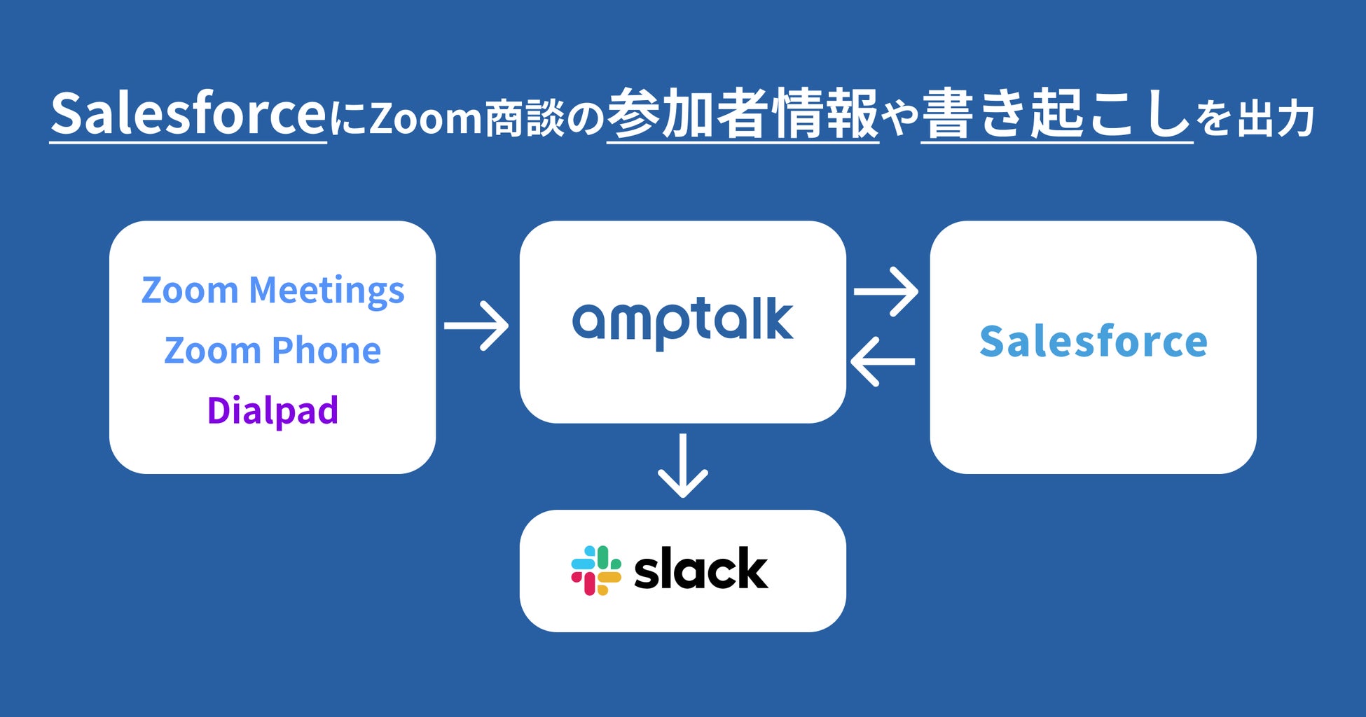 amptalk株式会社(本社:東京都渋谷区、代表取締役:猪瀬 竜馬、以下:amptalk)は、Zoom商談の録画やZoom Phone、Dialpadでの架電内容を自動で取得して書き起こし、さらにSalesforceに書き起こしや商談相手の情報を自動出力するオンライン商談自動化ツール「アンプトーク」が「アンプトーク | amptalk | インサイドセールスのIP電話・オンライン商談書き起こし・自動入力」として株式会社セールスフォース・ジャパンのAppExchangeで提供を開始されたことをアナウンスします。