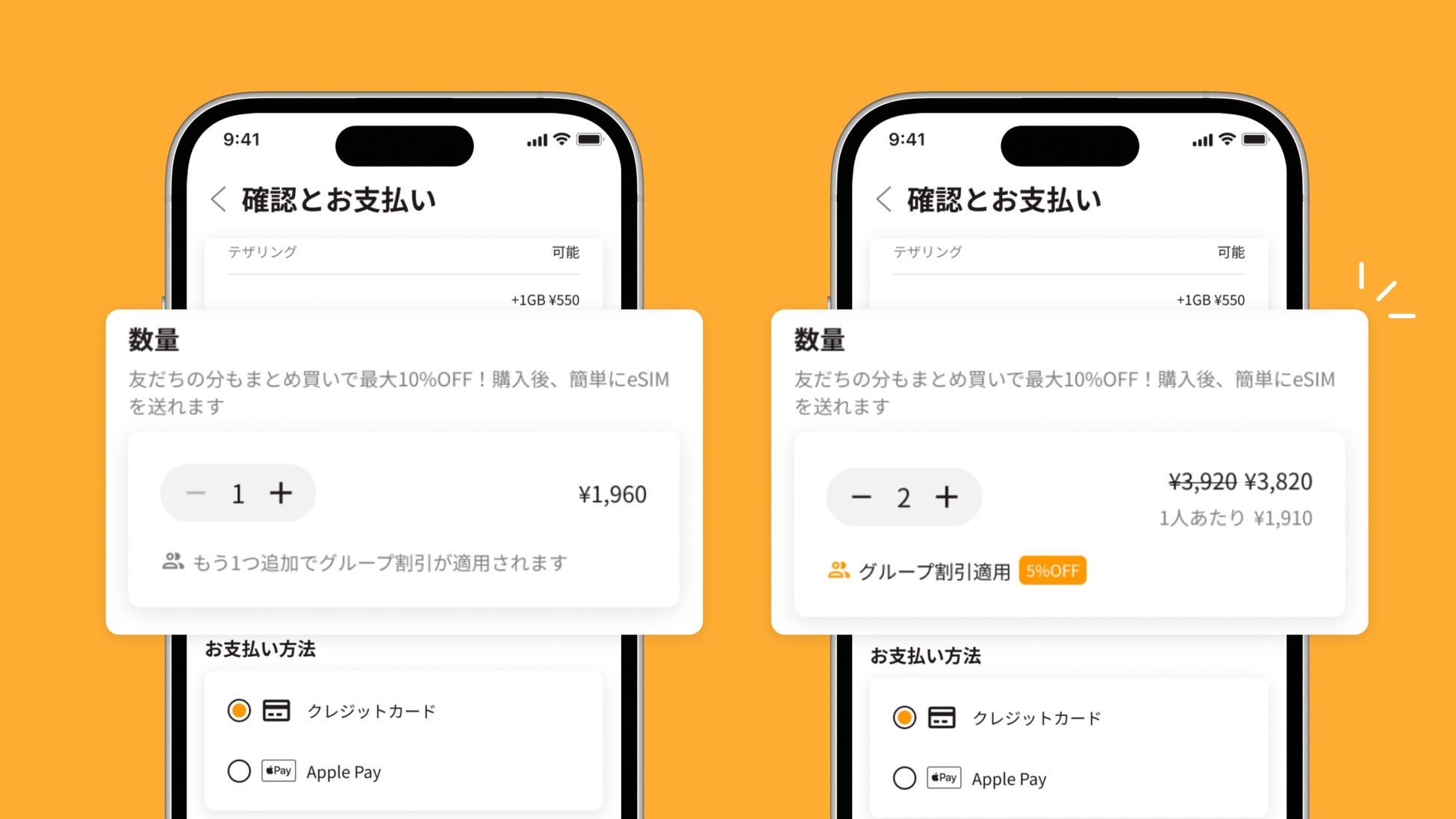 これにより、eSIMをまとめて購入し、友だちや家族に簡単に送れるようになりました!さらに、まとめ買いで割引が適用されるため、まとめて購入するほどお得になります!