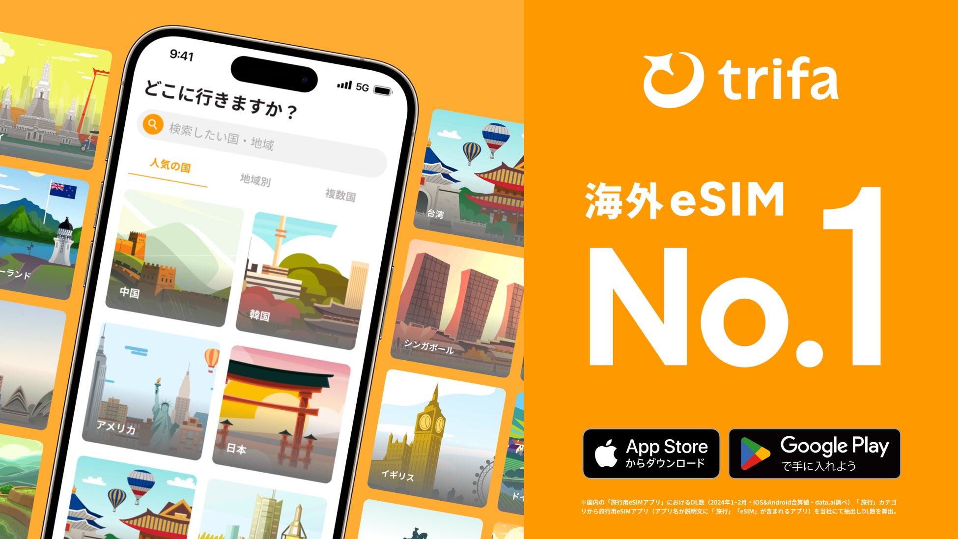現在トリファは国内のeSIMアプリとしてダウンロード数No.1 (*2) を誇り、国内旅行カテゴリランキングでもトップクラスの実績を持っています。