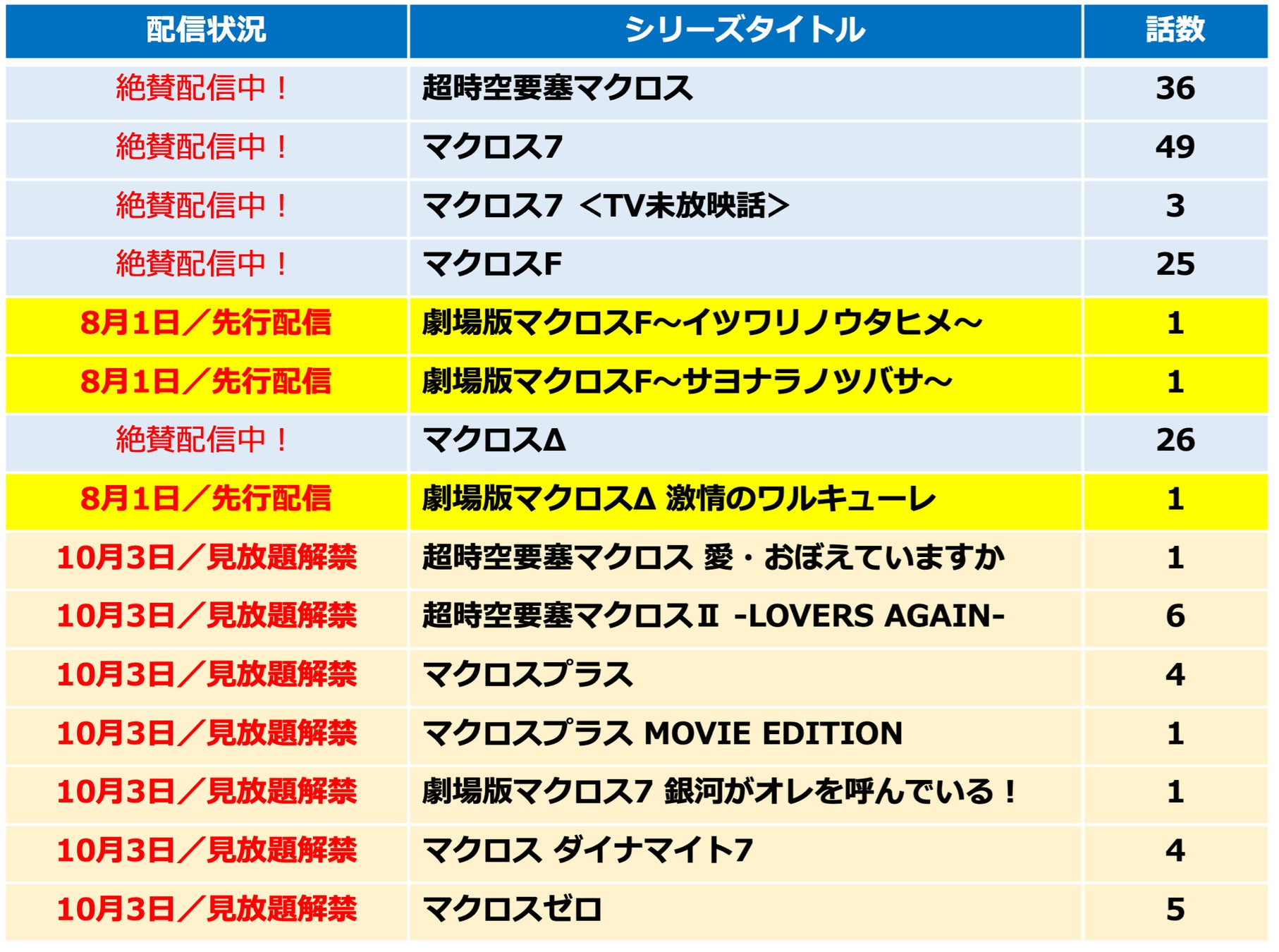 1982年の放送以来、今年で40周年を迎える『マクロス』シリーズ。Prime Video チャンネル『アニメタイムズ』では、劇場最新作『劇場版マクロスΔ 絶対LIVE!!!!!!/劇場短編マクロスF 〜時の迷宮〜』Blu-ray&DVDの2022年9月28日発売を記念して、その前編にあたる『劇場版マクロスF~イツワリノウタヒメ~』、『劇場版マクロスF~サヨナラノツバサ~』、『劇場版マクロスΔ 激情のワルキューレ』の3作品を2022年8月1日(月)より先行配信いたします。さらに、2022年10月3日(月)から、『超時空要塞マクロス 愛・おぼえていますか』、『超時空要塞マクロスⅡ -LOVERS AGAIN-』、『マクロスプラス』、『マクロスプラス MOVIE EDITION』、『劇場版マクロス7 銀河がオレを呼んでいる!』、『マクロス ダイナマイト7』、『マクロスゼロ』全7タイトルの見放題を一挙解禁いたします。なお、TVアニメシリーズ『超時空要塞マクロス』を初めとする他タイトルは、現在『アニメタイムズ』にて絶賛配信中です。ファン待望の大人気シリーズを含む初一挙見放題解禁、ぜひ『アニメタイムズ』でお楽しみください。