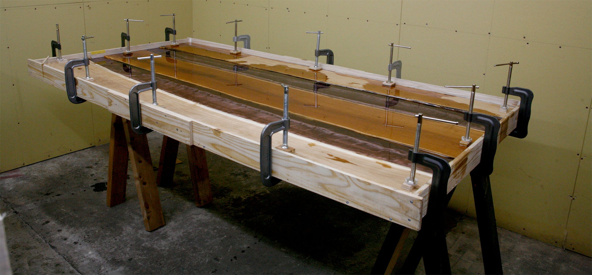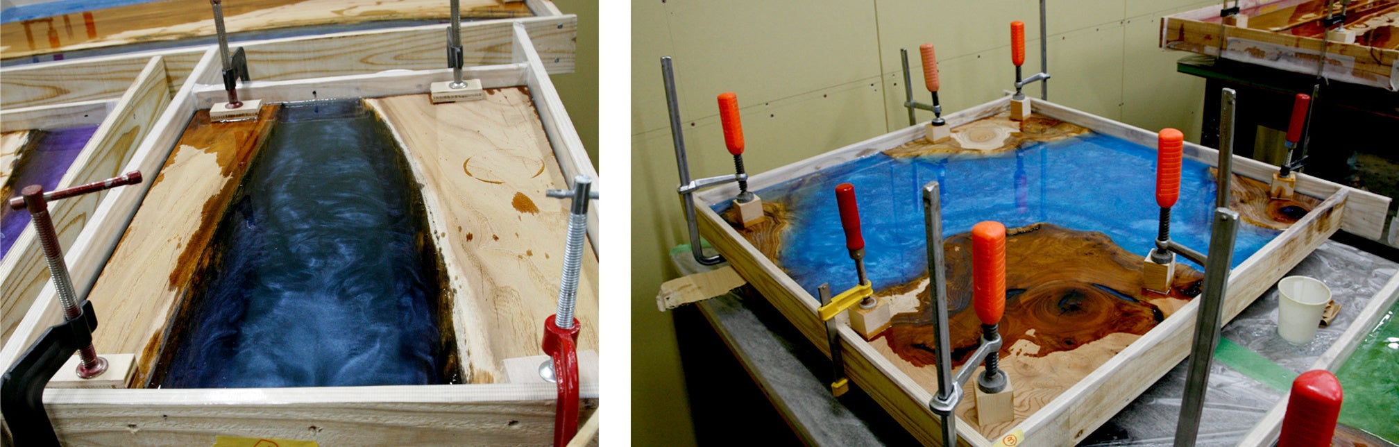 [写真:ユーアイヅ社屋にあるレジン専用ルーム。型枠をここに持込み作業を行う。木材をセットした型枠を作業用の天板の上に置く。この時、天板が水平に保たれていることが重要で樹脂を流し込んだ際、木材が浮かぬようクランプで固定していく。気泡を取り除きながら数時間置きに細い棒で混ぜて模様をつける。]