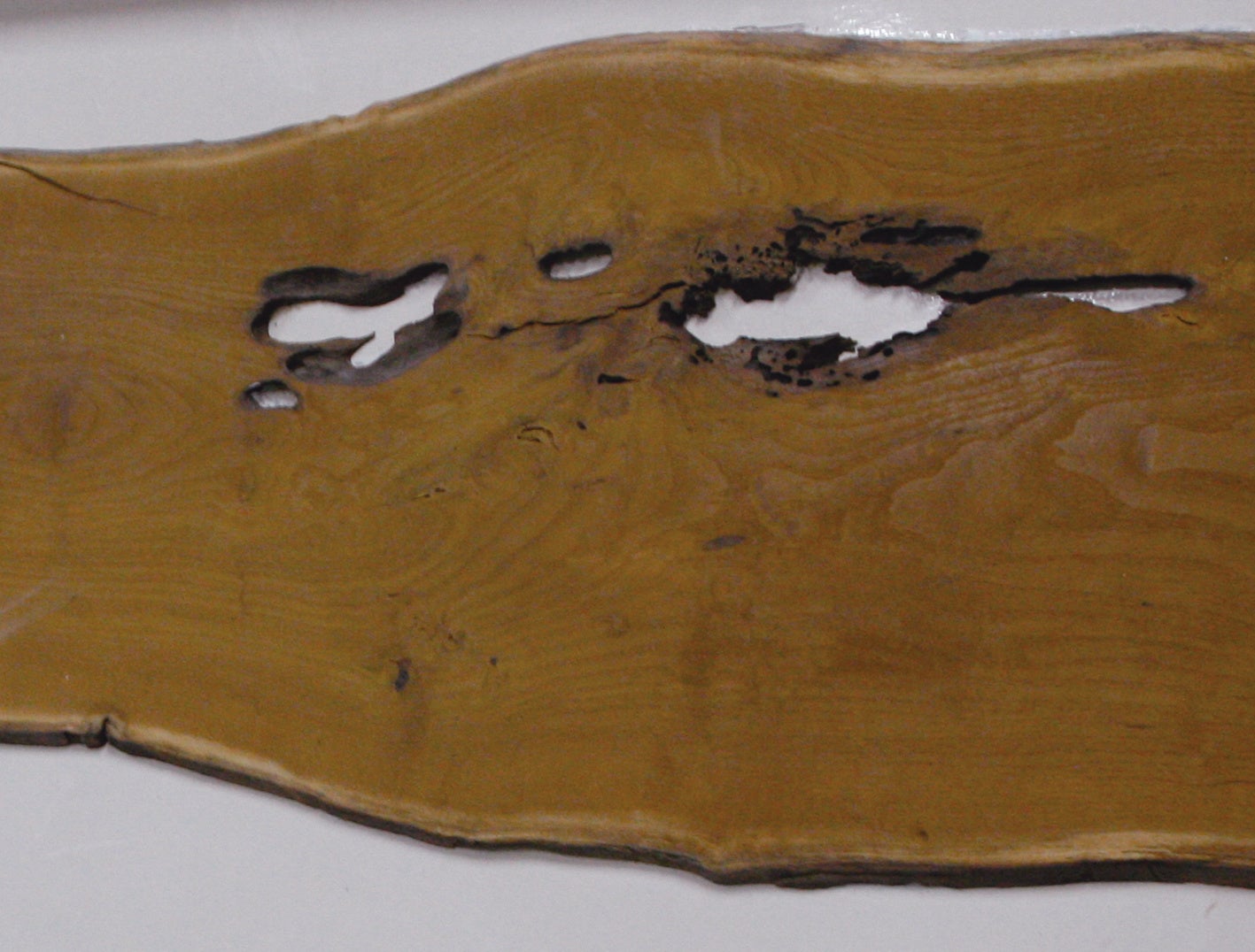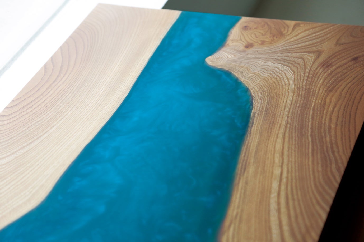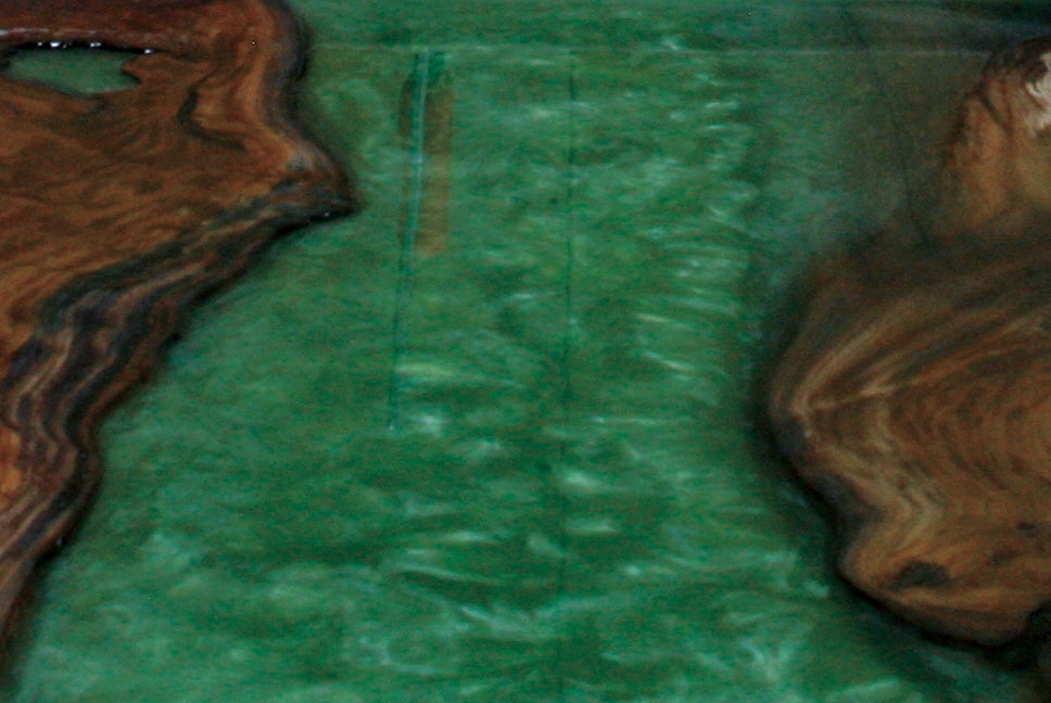 木目や形状など表情豊かな木材にレジン(樹脂)を流し込み、一枚の平らな木材にしています。