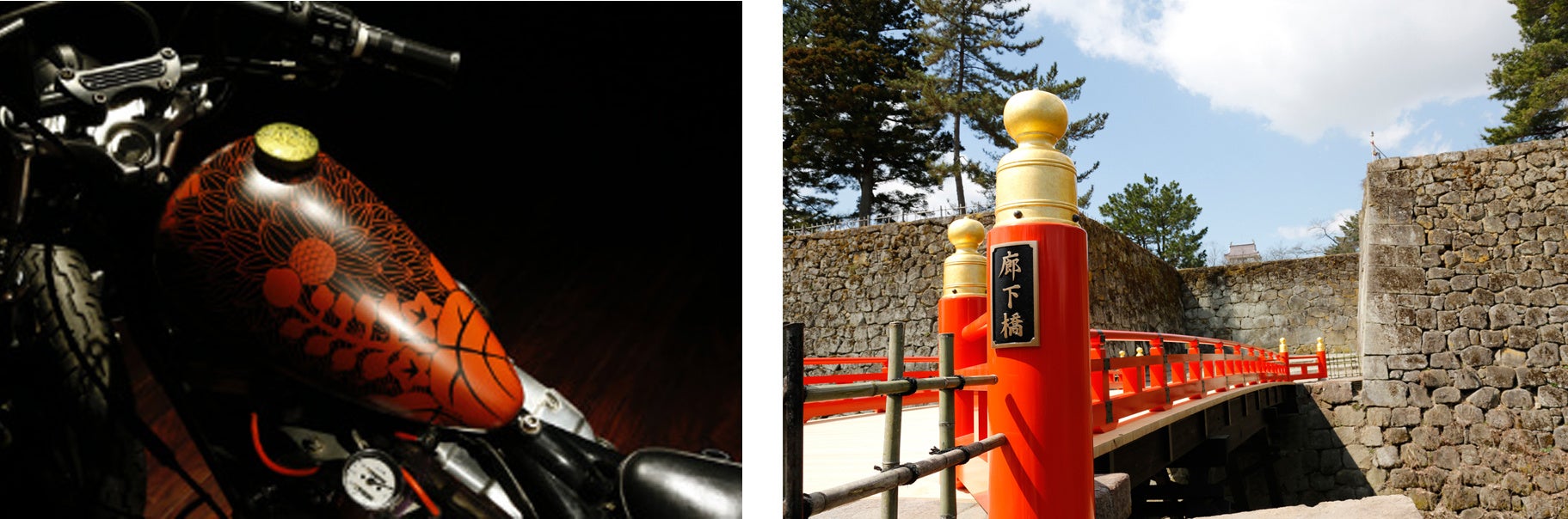 [写真:UV漆塗料の特性を生かしてユーアイヅが塗装を施した品々。オートバイのオイルタンク(左)、会津若松城・廊下橋(右)]