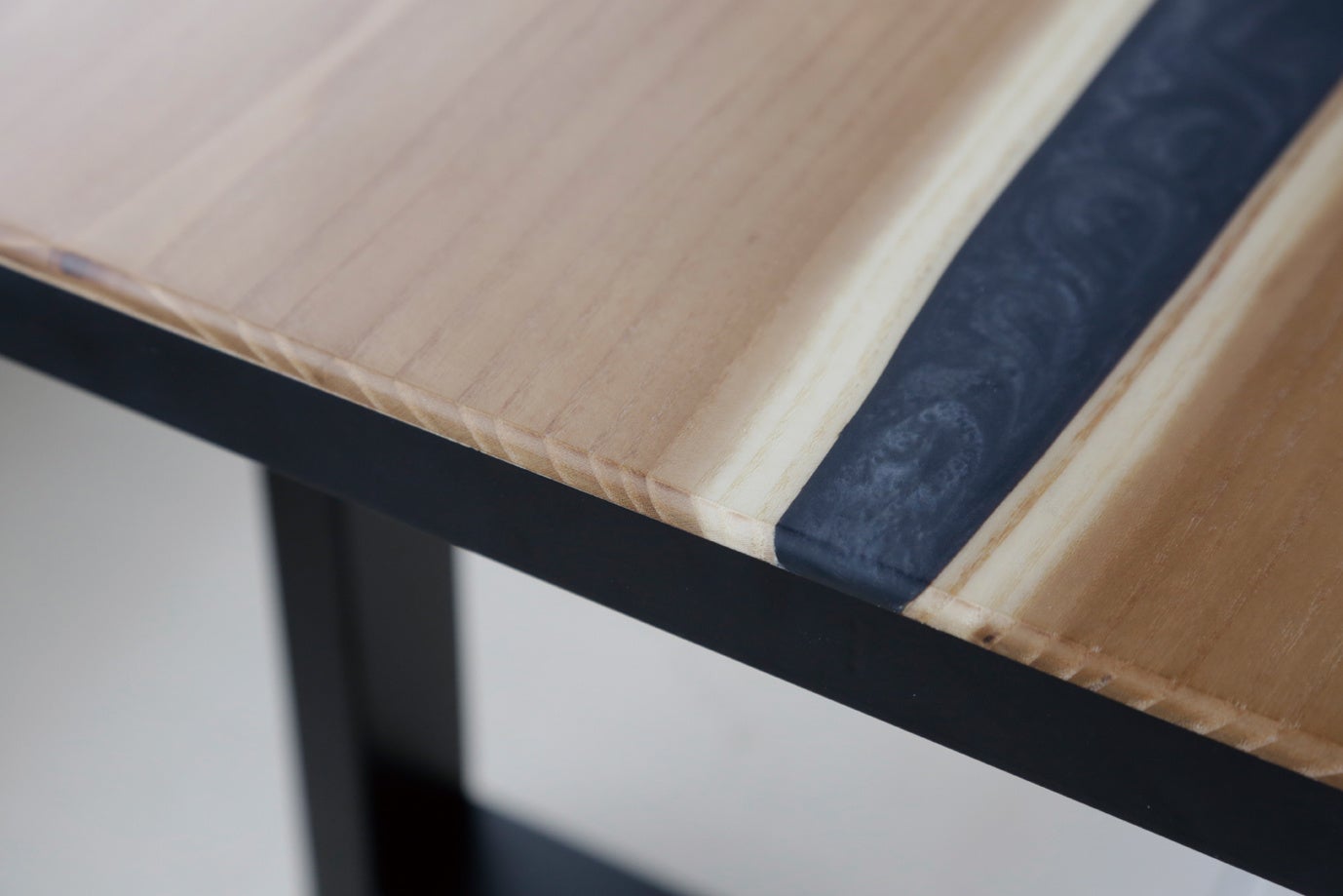 2019年、環境に配慮した新素材「植物由来のレジン(樹脂)」と出会ったことで、木の個性である節や割れ、曲がり具合もそのまま、家具・建材として必要な幅を確保することが可能となりました。さらに、耐久性のあるUV漆塗料を施すことで、漆独特の表面のふっくら感・色の深み・しっとりとした手触りがある素材として、活用の幅が広がり、今回、取り組みの第一弾として『銘木レジンテーブル』を制作しました。
