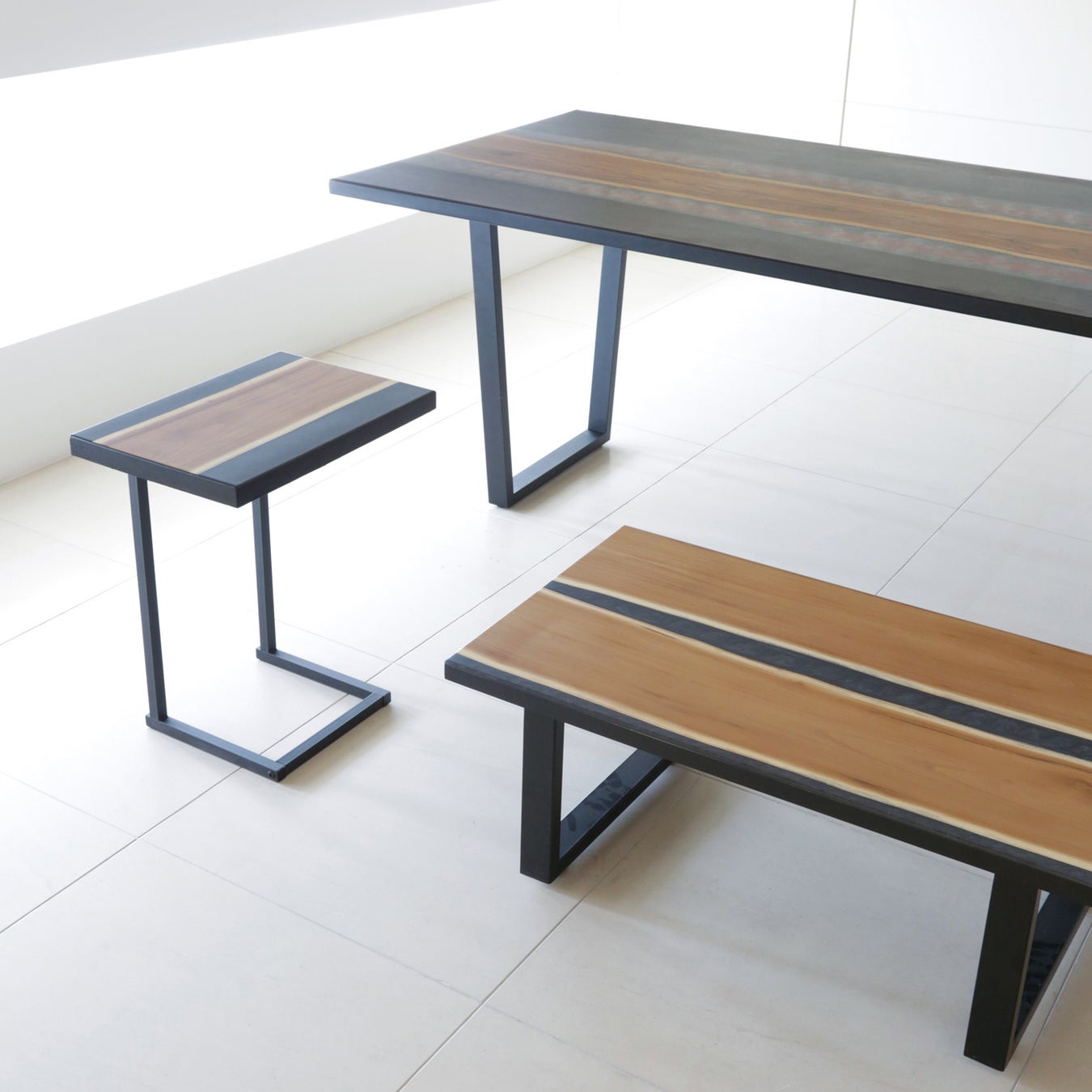 仏壇で使用する木材は、製品とした時に木目が綺麗に出るよう、木目がきめ細かい銘木を使用しています。今回、節や曲がりによって仏壇の部材として使用できない、その銘木を用い、植物由来のレジン(樹脂)を施し、木材本来の姿を生かしたテーブルを制作。傷や汚れが付きにくいUV漆塗料(紫外線硬化型漆塗料)で仕上げました。6人掛けのダイニングテーブル、サイドテーブルなど約15点を展示販売。期間中オーダーメイドも承っております。