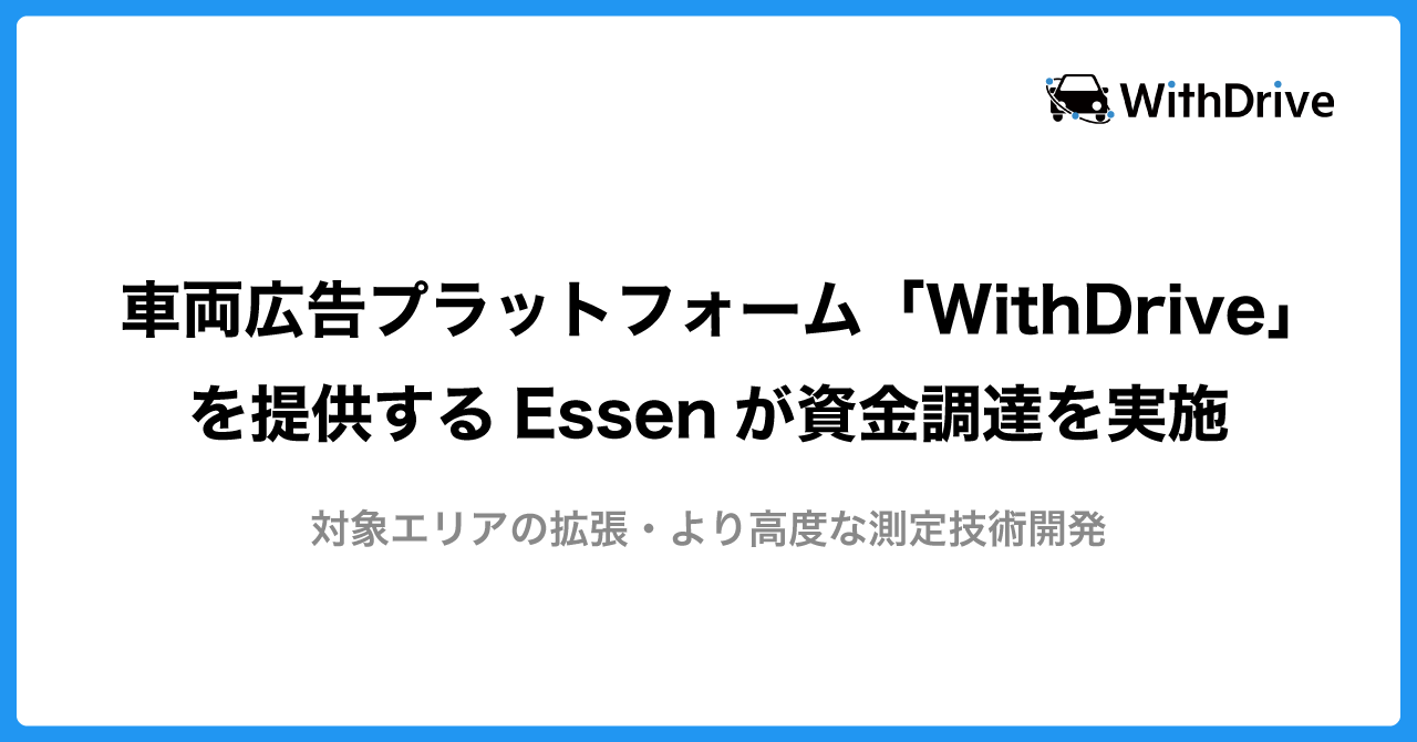 広告効果をAIで可視化できる車両屋外広告サービス「WithDrive」を提供する株式会社Essen(本社:神奈川県川崎市、代表取締役:橘 健吾、以下「Essen」)【https://www.essen-withdrive.com/ 】が、資金調達を実施しました。引受先はEast Venturesです。今回の増資で、サービス提供エリアの拡張と、より高度な測定技術開発を目指します。