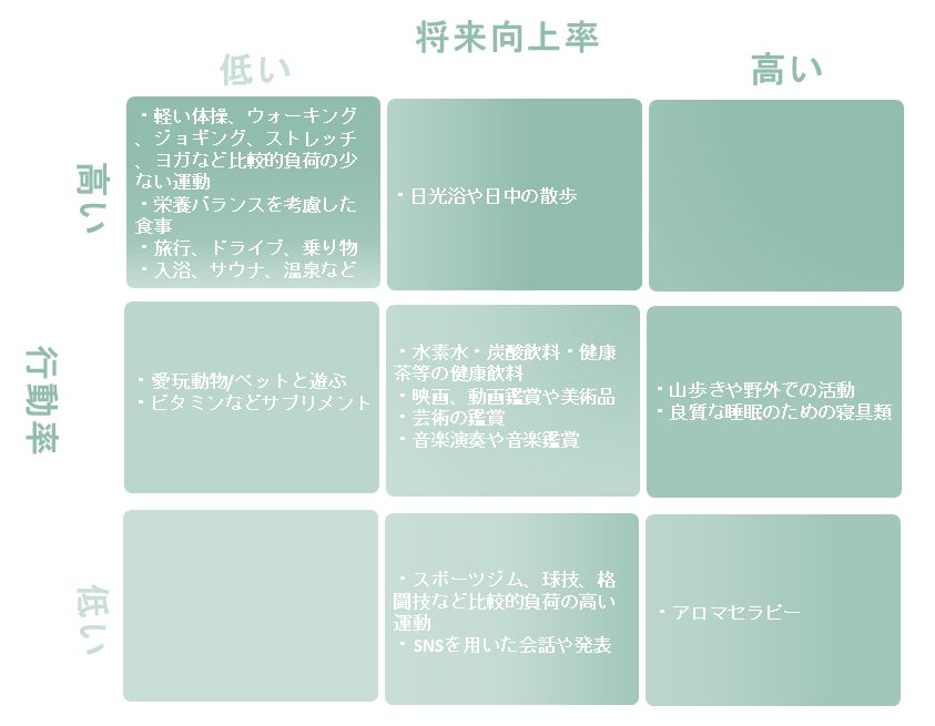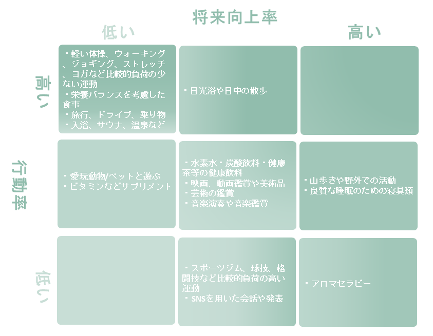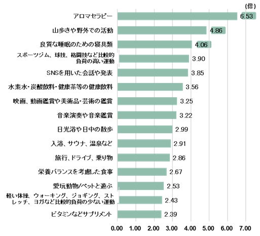 将来の行動意向率÷現在の行動率で将来向上率を算出していくと、「アロマセラピー」が6.5倍、「山歩きや野外での活動」が4.9倍、「良質な睡眠のための寝具類」が4.1倍と、カテゴリーの中で今後の拡大が予想される。