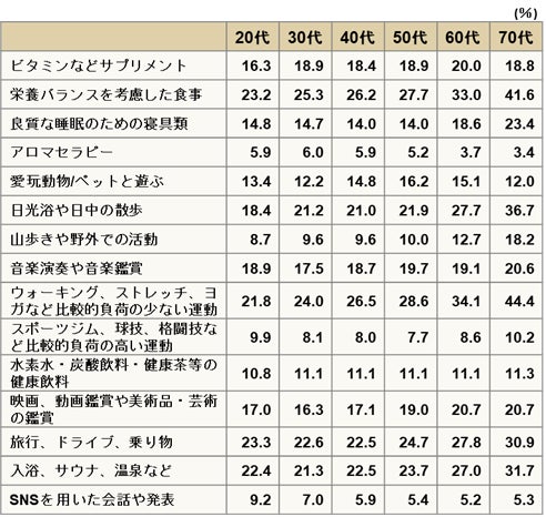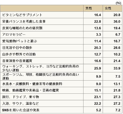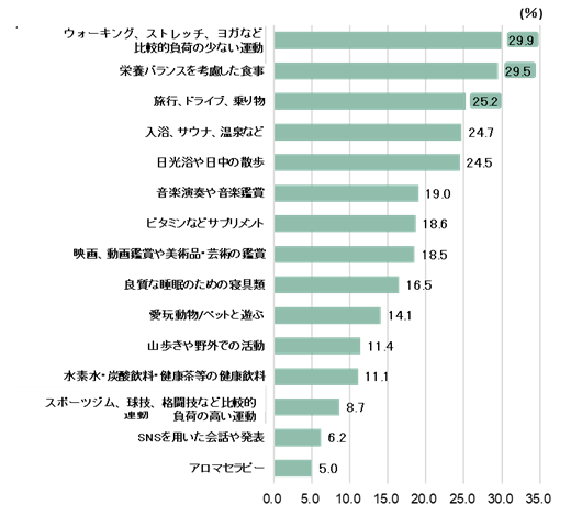 男性は、「軽い体操、ウォーキング、ジョギング、ストレッチ」、「旅行、ドライブ、温泉など」、「栄養バランスを考慮した食事」と続く。女性は、「栄養バランスを考慮した食事」、「軽い体操、ウォーキング、ジョギング、ストレッチ」、「日光浴や日中の散歩」が上位を占めている