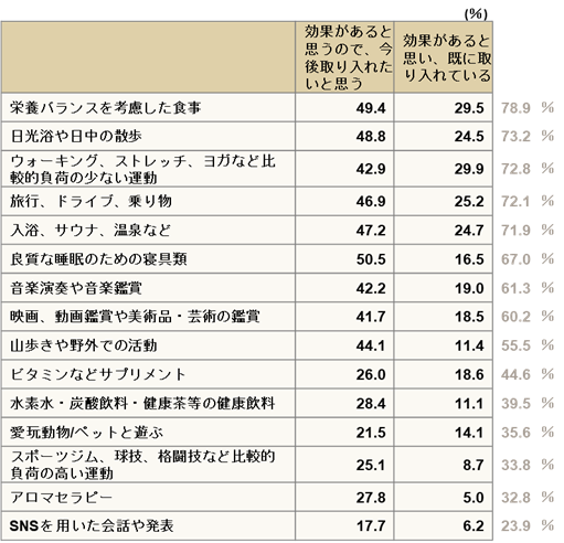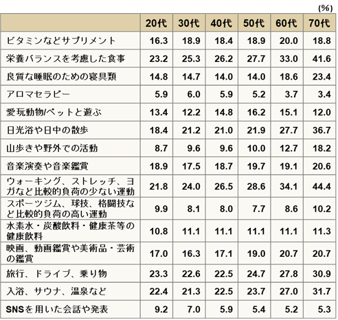 年代別で大きな変化があるカテゴリーは、年齢を重ねていくと差が大きくなるカテゴリーは「栄養バランスを考慮した食事」、「良質な睡眠のための寝具類」「日光浴や日中の散歩」「山歩きや野外での活動」「ウォーキング、ストレッチ、ヨガなど比較的負荷の少ない運動」。一方、若い世代が高くなるカテゴリーは「SNSを用いた会話や発表」となる。