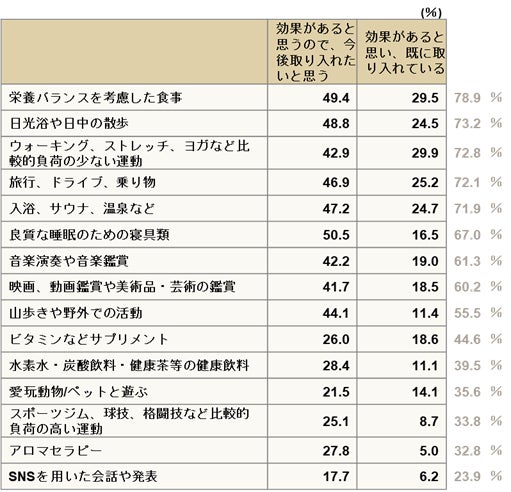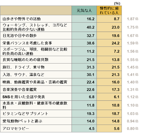 疲労度合で比較すると、元気な人は「山歩きや野外での活動」、「ウォーキング、ストレッチ、ヨガなど比較的負荷の少ない運動」、「山歩きや野外での活動」、「栄養バランスを考慮した食事」、「スポーツジム、球技、格闘技など比較的負荷の高い運動」と続いている。疲れている方がより実践している行動が、「アロマテラピー」「愛玩動物/ペットと遊ぶ」などになっている。