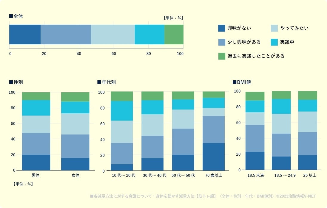 全体を通して【少し興味がある】【やってみたい】の回答割合が多い結果となりました。また、男性で20%、10~20代で25%の方が「筋トレ(パーソナルトレーニングジム等を含む」を【実践中】の回答があり、筋トレは若い方に人気があるようです。