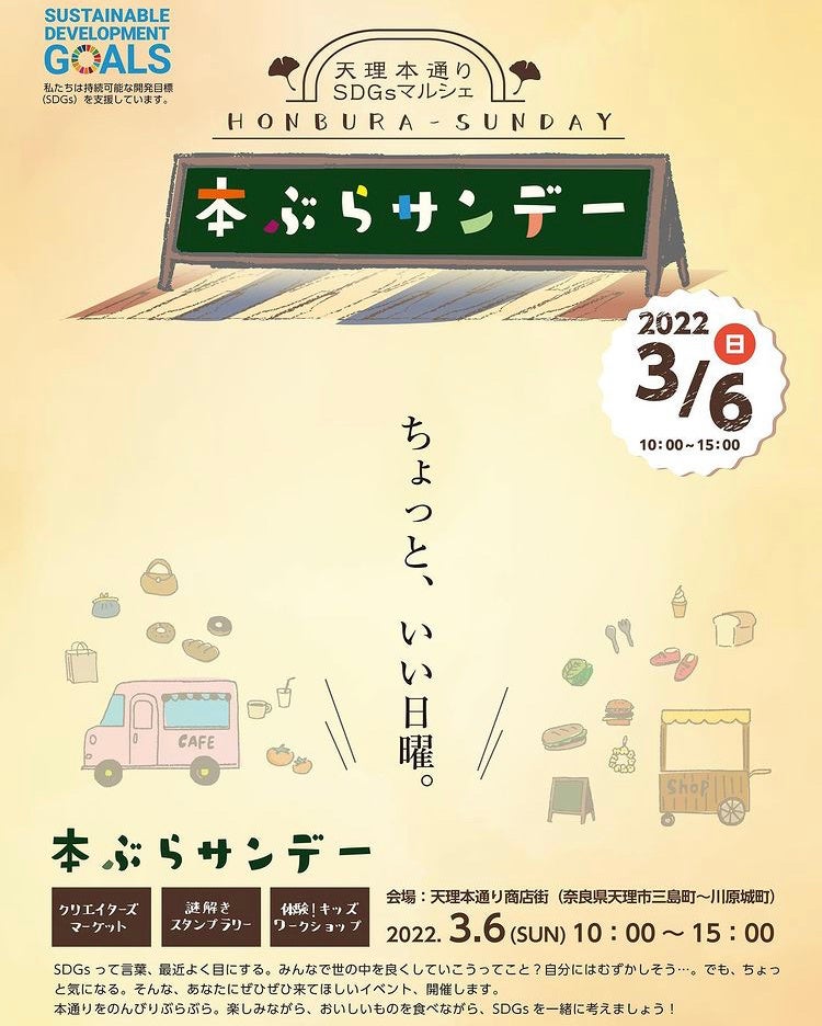 3月6日(日)に天理本通り商店街で「本ぶらサンデー 天理本通りSDGsマルシェ」を開催します。賑わいとSDGsの理念をつないで、街への愛着を育むイベントです。クリエイターズマーケットやキッズワークショップを楽しみ、おいしいものを食べながら、SDGsを一緒に考えましょう! みなさんが輝く、持続可能な明日への一歩ですので、ぜひ、遊びに来てください。