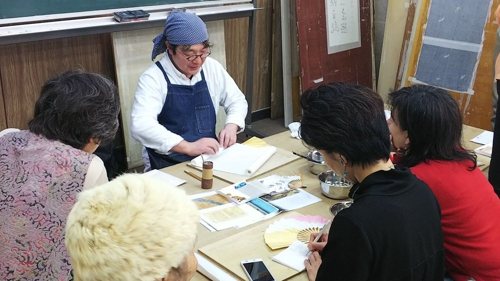 ㈱菊池襖紙工場様は、約100年の歴史があり、襖間から壁紙まで製造、販売する企業です。中でも日本古来の伝統的な襖紙の装飾技法を受け継ぎ伝えていくため、伝統工芸の専門チームを設立しております。今回、この伝統工芸の専門スタッフに体験の手ほどきをして頂きます。扇子に砂子体験だけではなく、コースター、アクリルブロック、うちわなどでも「砂子」体験は可能です。詳しくは当日、スタッフにお尋ねください。公式ウェブサイトはこちら