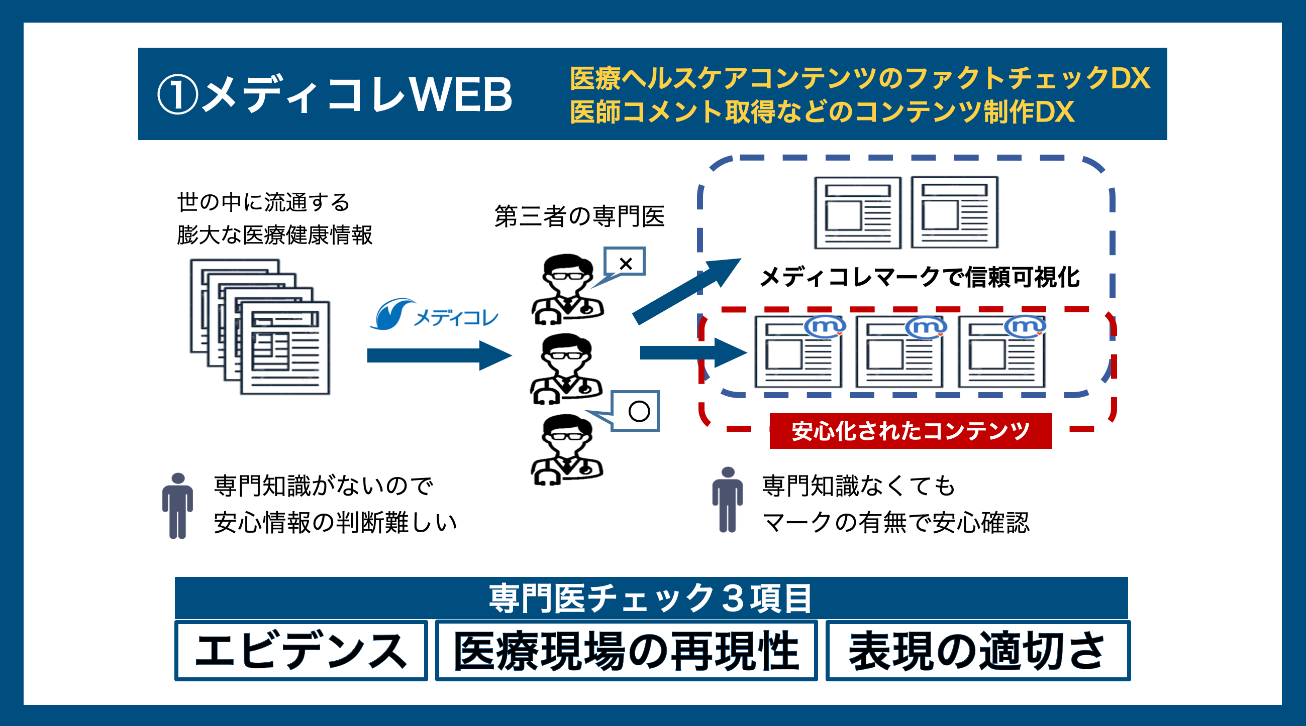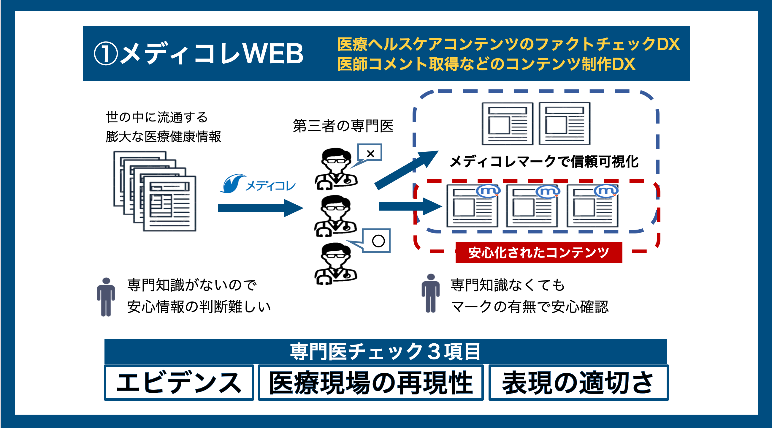 医師がオンライン上で医療・ヘルスケア情報のチェック+掲載可能な実名顔写真込みのコメントを提供。