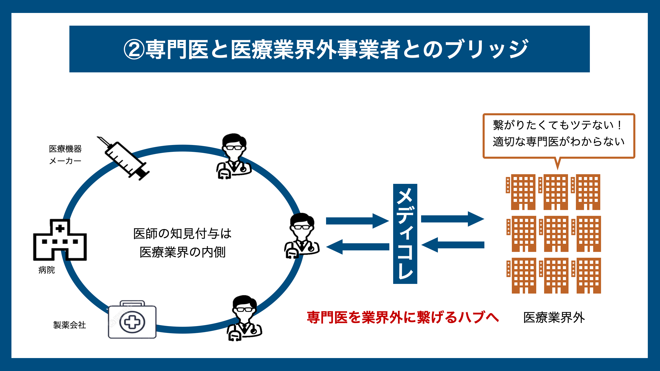 ヘルスケア企業など医療業界外の事業社に医師の知見を接続してマーケティングを実施します。