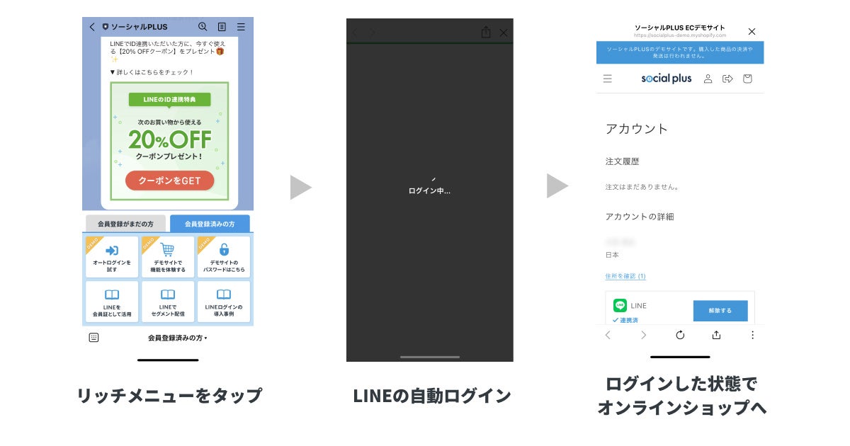 さらに、LINEの自動ログイン機能も組み合わせれば、リッチメニューから1タップでログインして購入完了!という便利な導線設計も可能です。