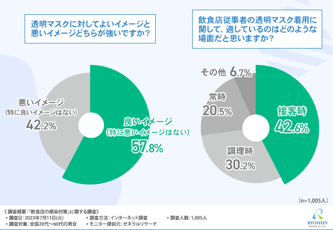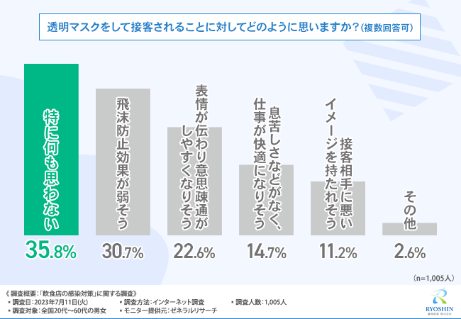 そこで今回、透明マスク『マスクリア』(https://www.ryoshin.com/service/masclear/)を販売する菱神産業株式会社(https://www.ryoshin.com)は、全国20~60代の男女を対象に、「飲食店の感染対策」に関する調査を実施しました。