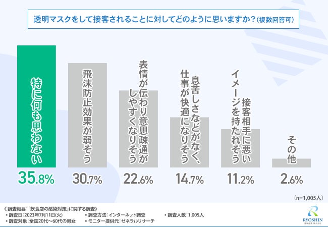 「透明マスクをして接客されることに対してどのように思いますか?(複数回答可)」と質問したところ『特に何も思わない(35.8%)』と回答した方が最も多く、次いで『飛沫防止効果が弱そう(30.7%)』『表情が伝わり意思疎通がしやすくなりそう(22.6%)』『息苦しさなどがなく、仕事が快適になりそう(14.7%)』『接客相手に悪いイメージを持たれそう(11.2%)』と続きました。