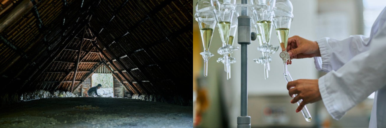 原料としているのは、別府温泉で350年ほど前から作られている湯の花。別府の山で採れた青粘土でのみ反応する、温泉の結晶です。湯の花は自然にできるものではなくとても繊細で、夏場で40日以上、冬場では60~70日の時間をかけて、職人が大切に育て上げ、作られます。採取した湯の花から不純物を取り除くために、別府の温泉水を混ぜ、約1ヶ月置いておきます。ゆっくりゆっくり時間をかけながら、琥珀色の湯の花エキスを精製・抽出します。
