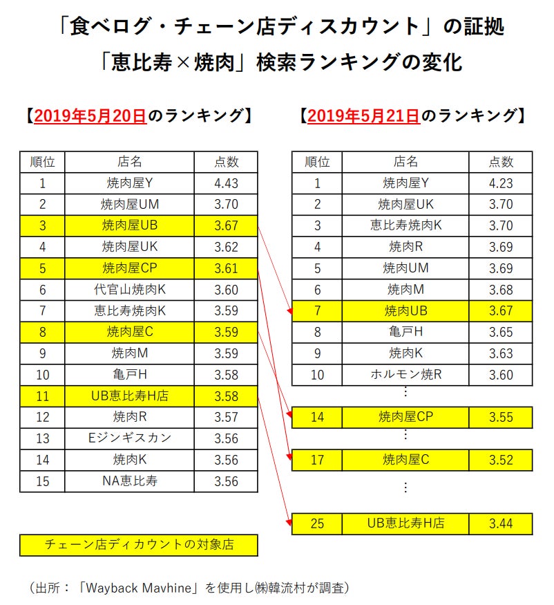 以下の食べログの「恵比寿 X 焼肉」ランキング例が示すとおり、2019年5月21日を前後に、チェーン店の点数とランキングが大幅に下がり、食べログユーザーが実際につけた点数とランキングとは全く違うランキングが表示されることによって、競争環境は歪められ、食べログユーザーは誤った選択を強いられ、点数とランキングを恣意的に下げられた対象店舗は客足と売上の減少を強いられました。