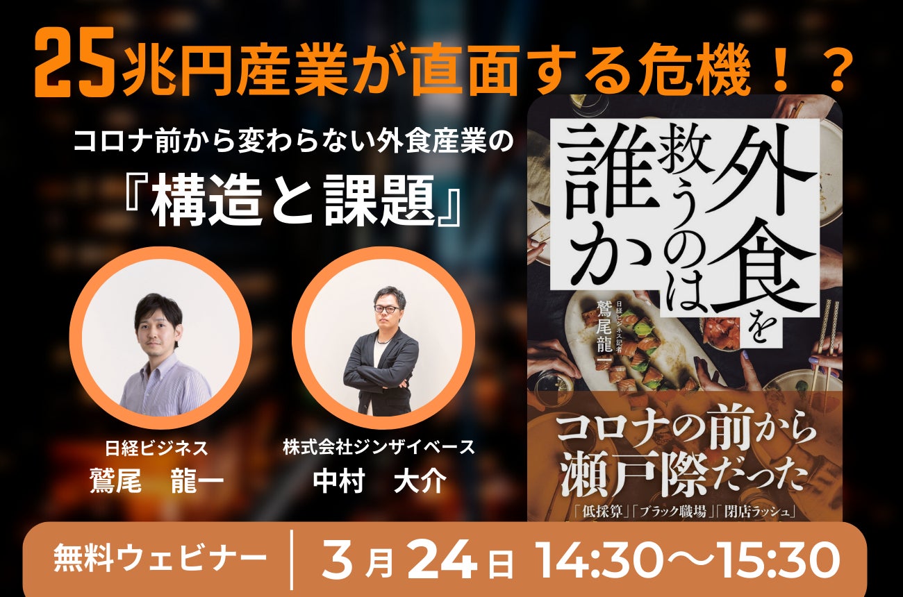 株式会社ジンザイベース(本社:東京都千代田区、代表取締役:中村大介)は、鷲尾龍一氏(日経ビジネス記者)と合同で『25兆円産業が直面する危機!? - コロナ前から変わらない外食産業の「構造と課題」』をテーマにオンラインセミナーを3月24日(金)に開催いたします。