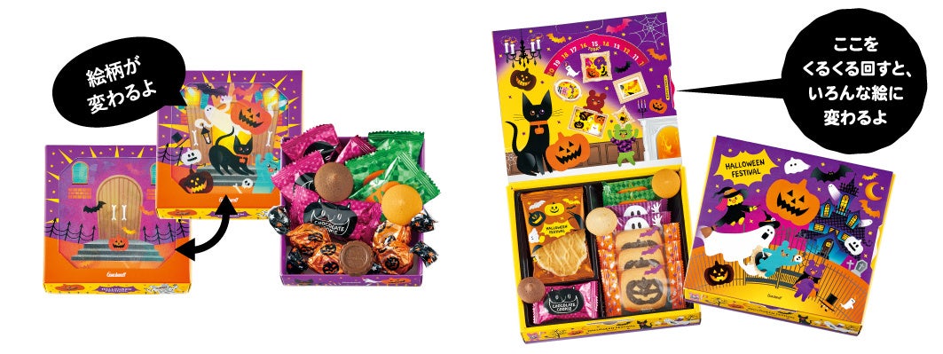 チェンジングシート(角度で絵柄がかわる不思議なシート)がついた「HWクッキー&チョコレート」や、横のツマミをクルクル回してハロウィンまでカウントダウンを楽しむ「ハロウィンアソートクッキー」など、プレゼントとして渡しても、自分用に買ってもさまざまな楽しみ方を見つけることができます。