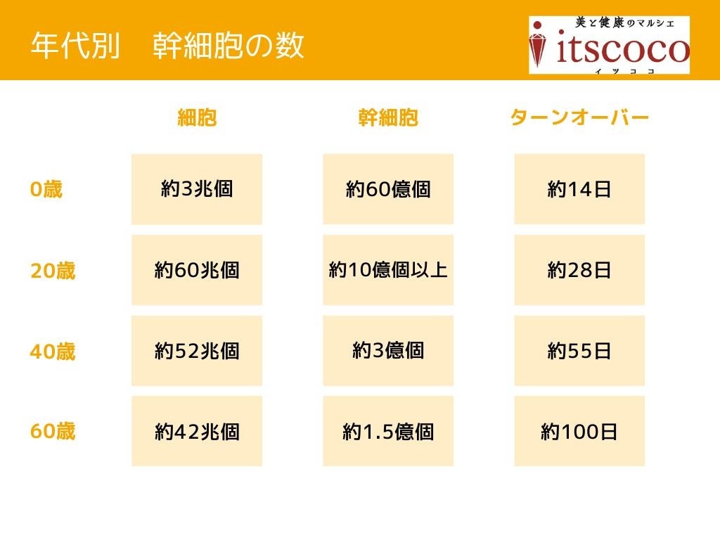 上記の図で分かる通り、人間の幹細胞の数は年齢とともに少なくなります。