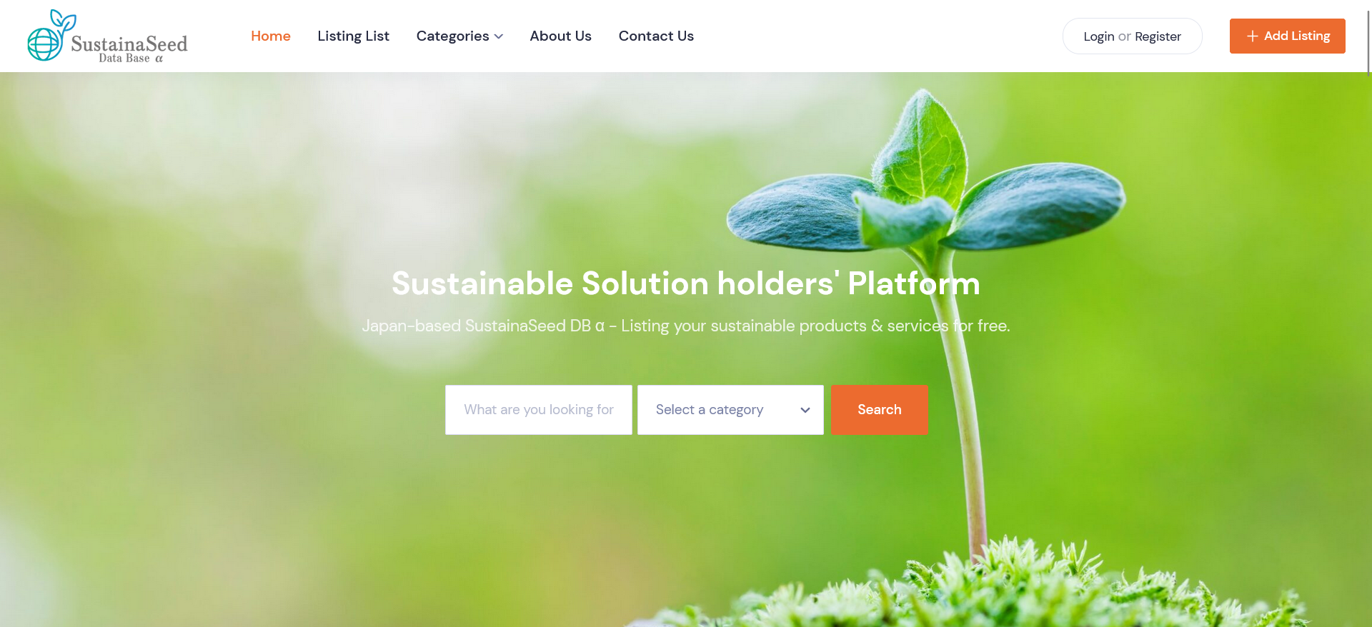 サスティナビリティ課題は、日本のみならず全世界に共通しており、各々の企業では早急な対応が迫られている現状です。一般的に展示会等は開催期間が数日と短い為、サスティナブル課題解決手段を持つ企業と常に出会うことが出来る場所が必要であると考え、作られたのがSustainaSeed DB(https://db.sustainaseed.net)です。現在のプロトタイプ版では、グローバルを意識し、英語での提供となっております。
