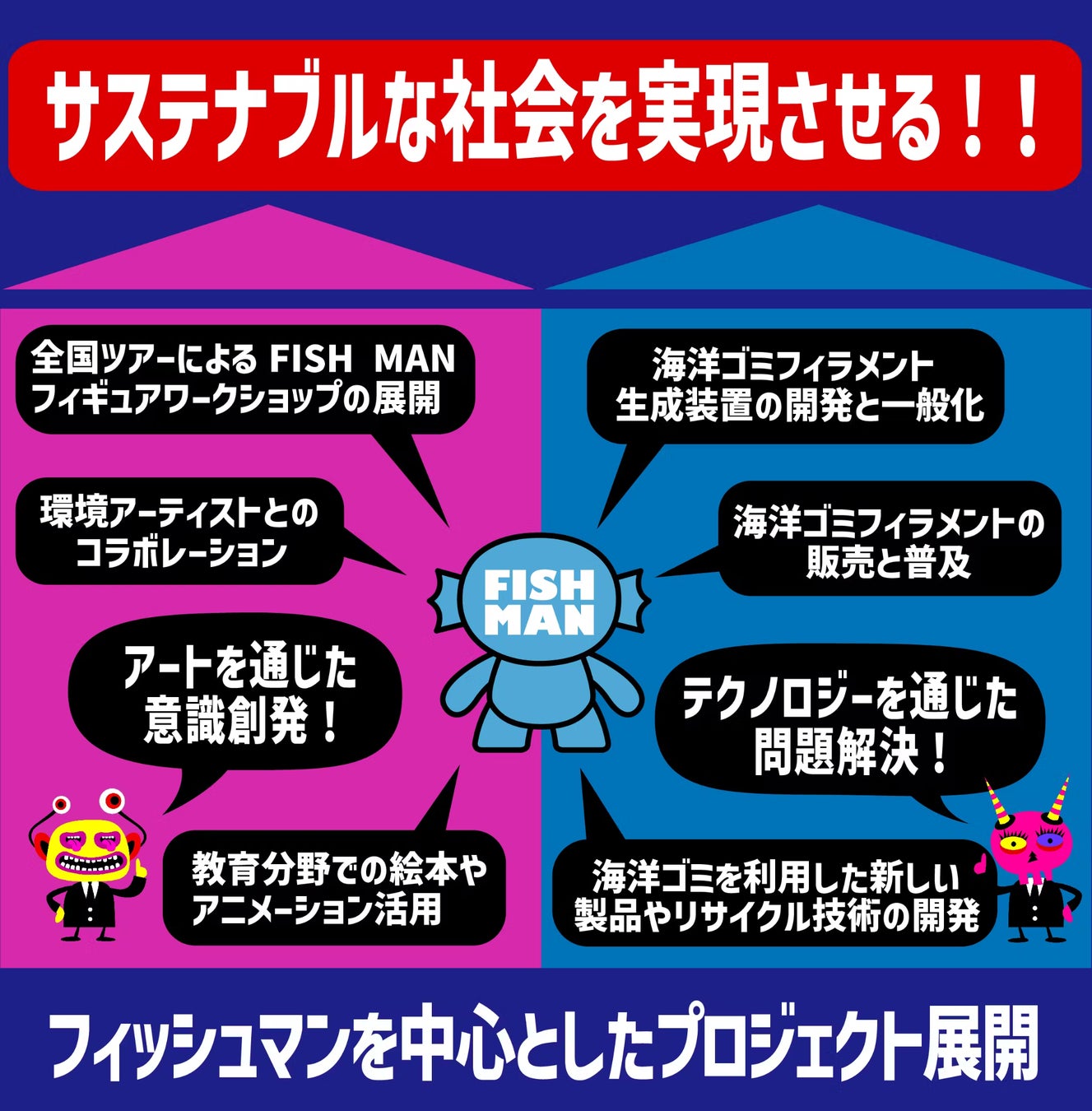 FISH MAN PROJECTでは、アートとテクノロジーを掛け合わせ、サステナブルな社会へ向けての解決策を探ります。アート分野では、ワークショップや環境アーティストとのコラボ、教育用の絵本やアニメーションを通じて、人々の意識や行動を創発していきます。一方、テクノロジーでは、海洋ゴミからフィラメントを作る装置を開発し、新しい製品やリサイクル技術を創出し、本質的な問題解決に向かいます。