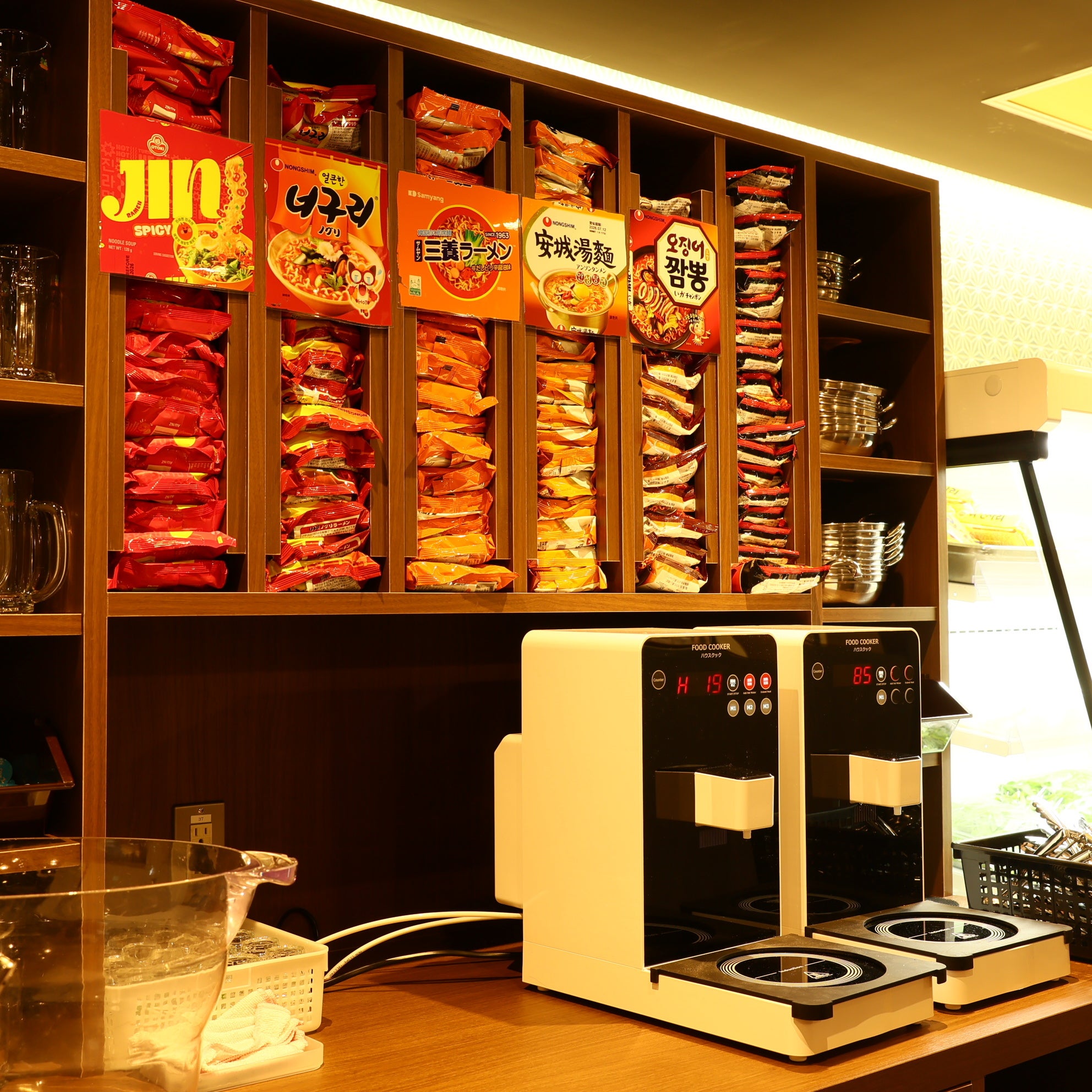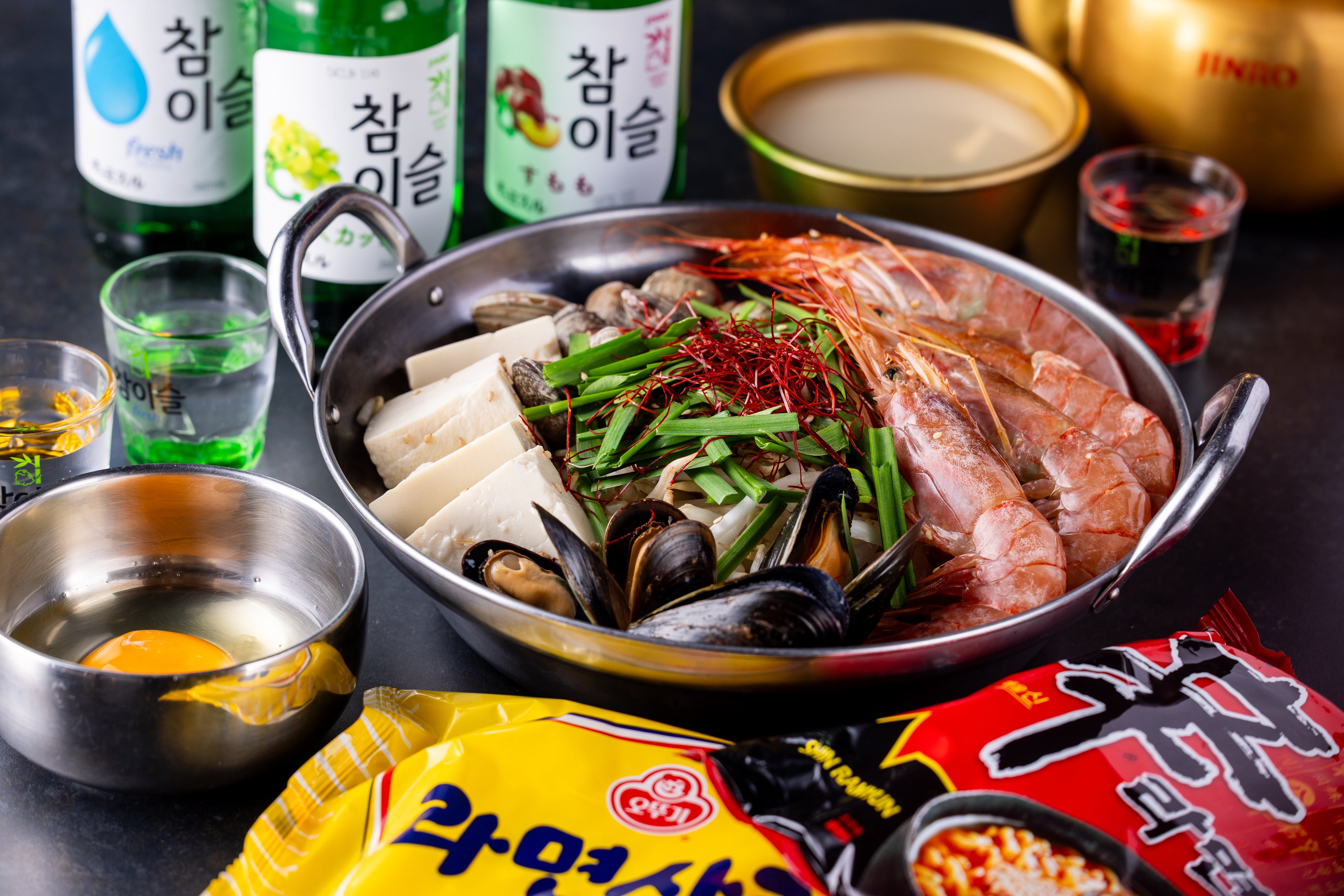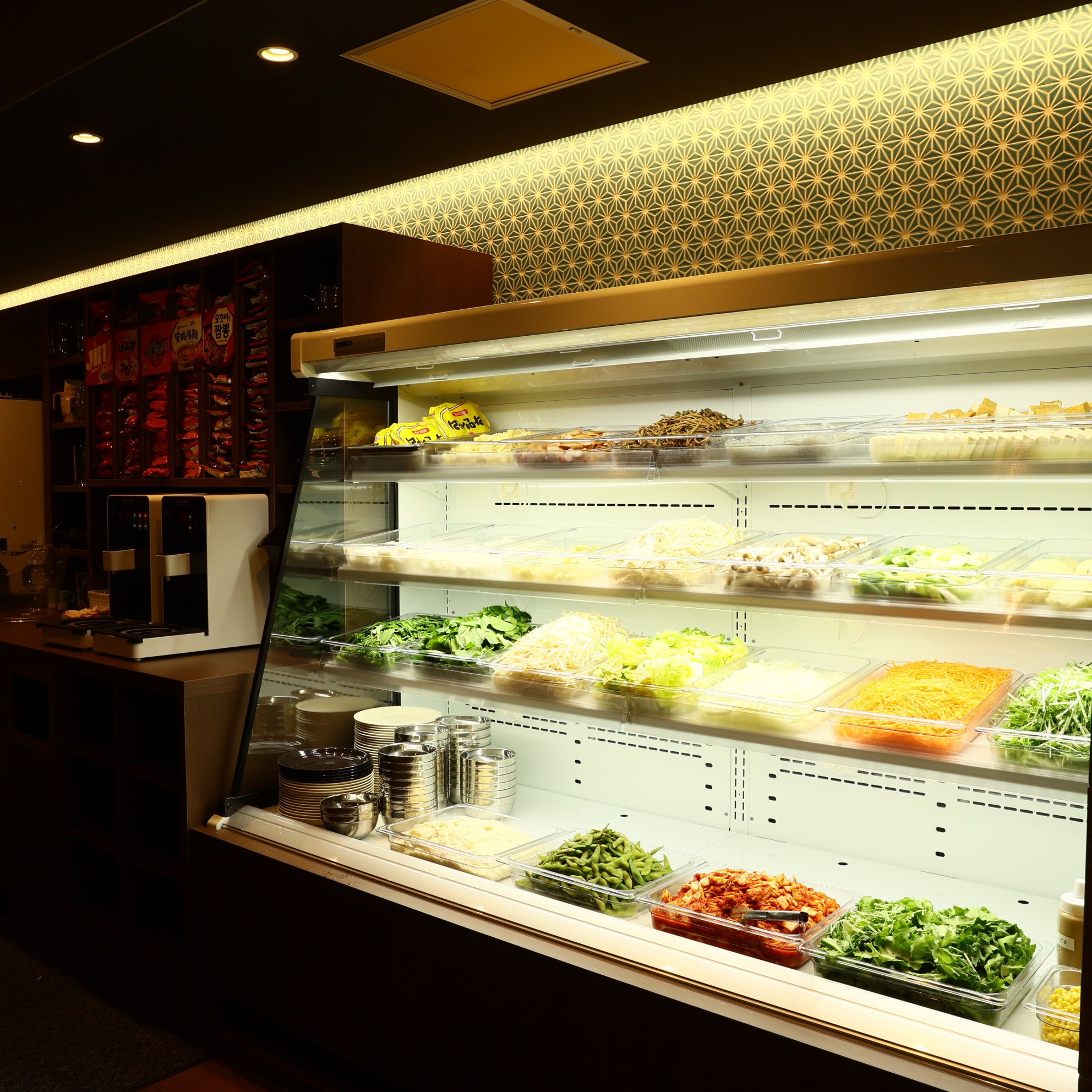 鍋は、5種類をラインナップ。鍋の肉はコースによって異なり、オーダー式の食べ放題で楽しめます。野菜などの具材はセルフ方式で、好みに応じて自由に組み合わせるスタイルです。また、からあげやトッポギ、チヂミなどのサイドメニューも食べ放題で用意しました。さらに、数種類の韓国袋めんを揃えており、鍋の〆や、ラーメンマシンで調理して楽しむこともできます。