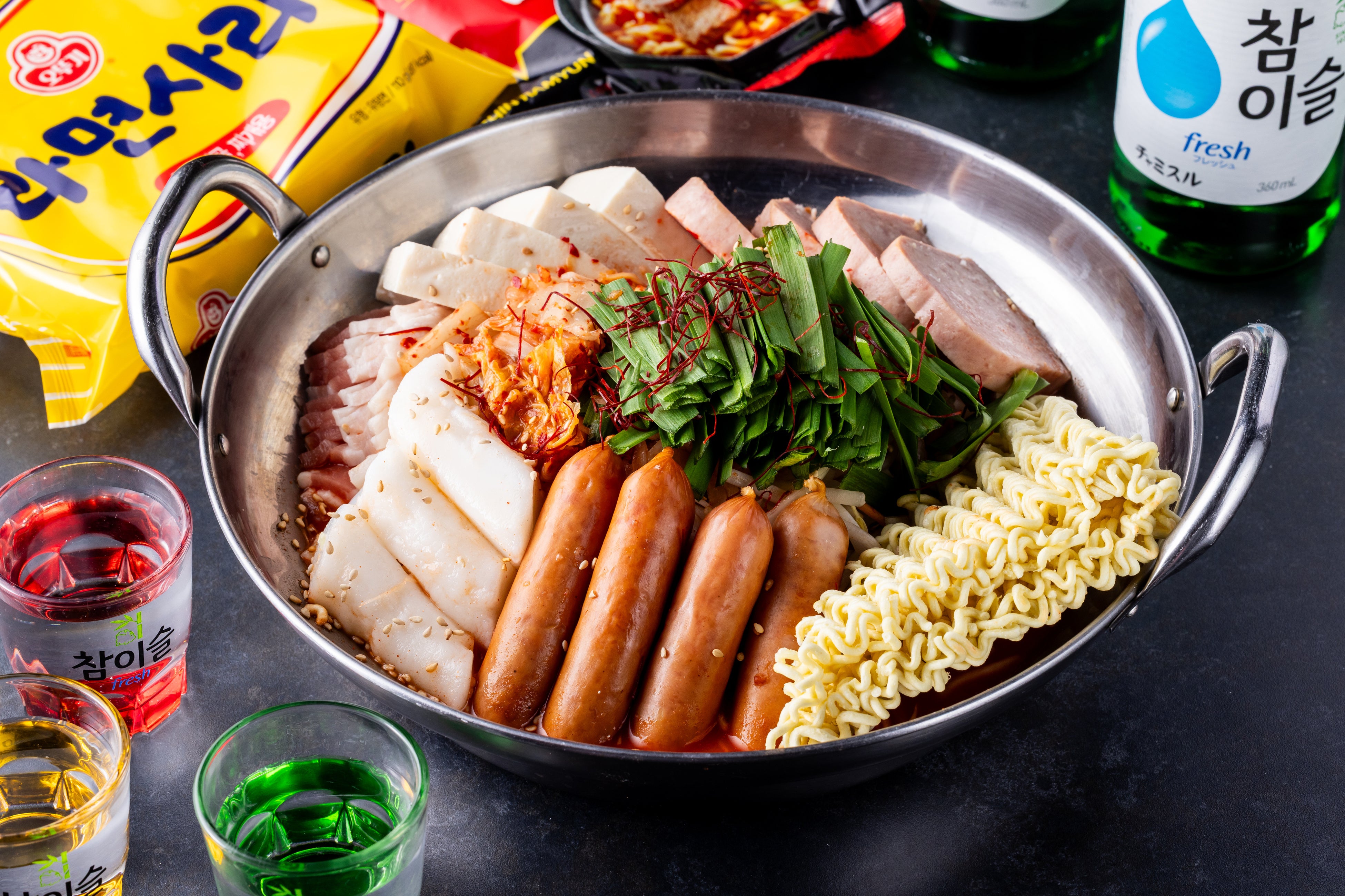 キムチ味に、ソーセージやスパムなど加工肉の旨みが溶け合う、韓国定番の辛旨鍋。ソーセージ、スパム、豚肉、キムチ、豆腐、麺入りで食べ応えを意識しました。
