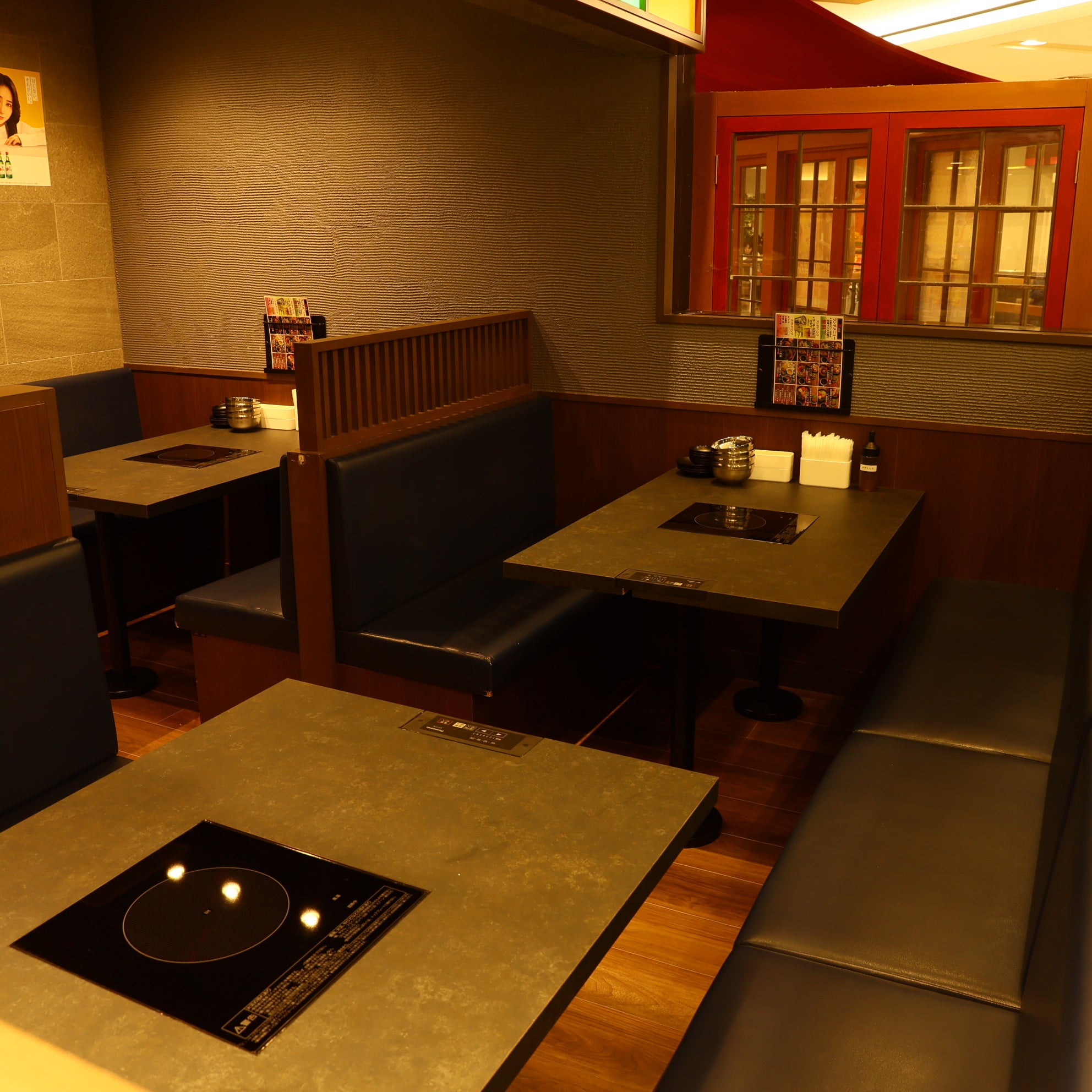 外観は韓国の伝統家屋をモチーフにした、瓦の軒先が印象的な半オープンスペースのファサードとし、商業施設内にありながら路面店のような入りやすさを演出しています。店内は落ち着いたシックな雰囲気で統一し、ゆっくりと鍋や韓国料理を楽しめる空間に仕上げました。