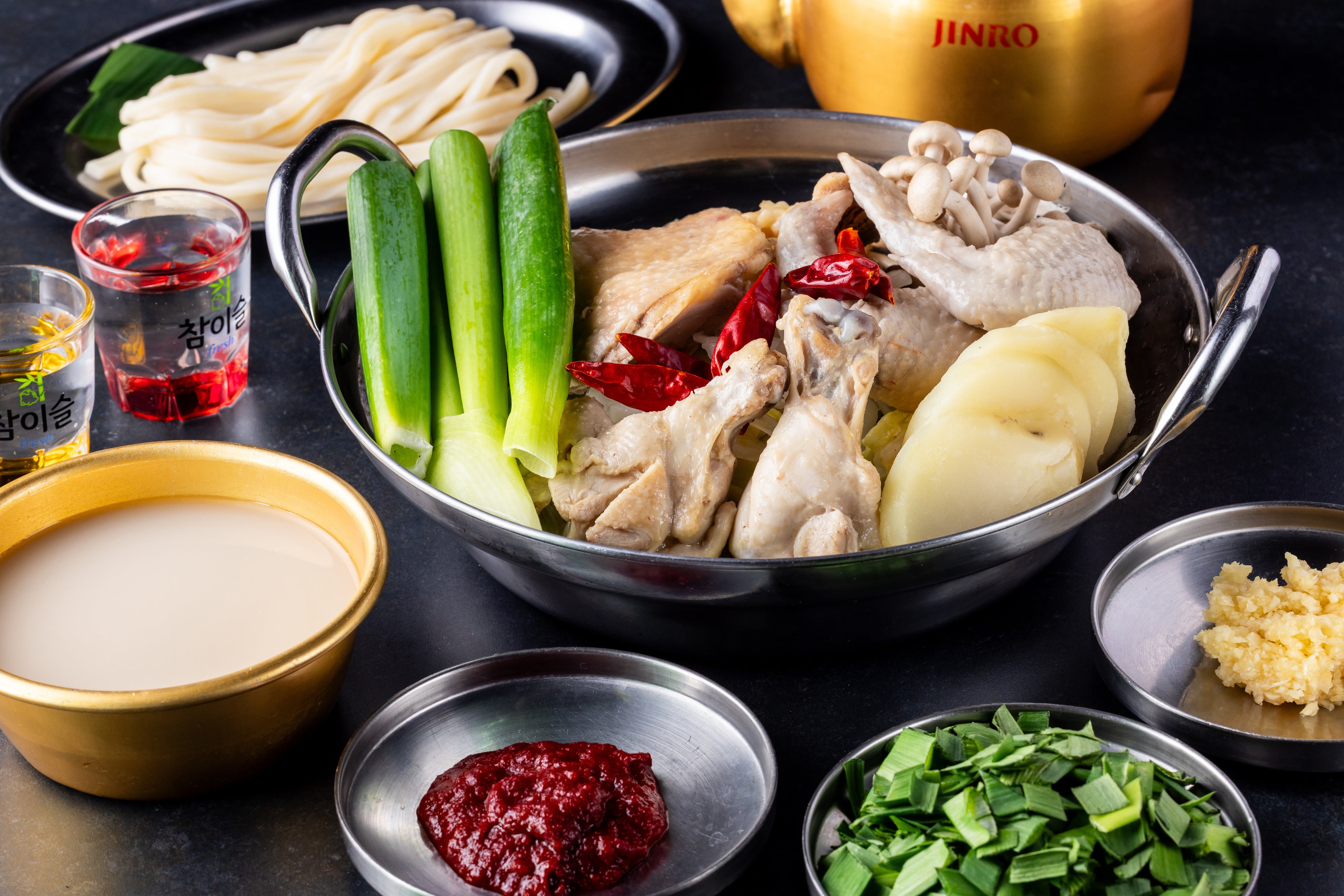 丸鶏を一羽丸ごと煮込み、澄んだ鶏だしの旨みを引き出しました。鶏肉、長ねぎ、じゃがいも、トッポギなどの具材を、タレで味の変化を楽しめます。