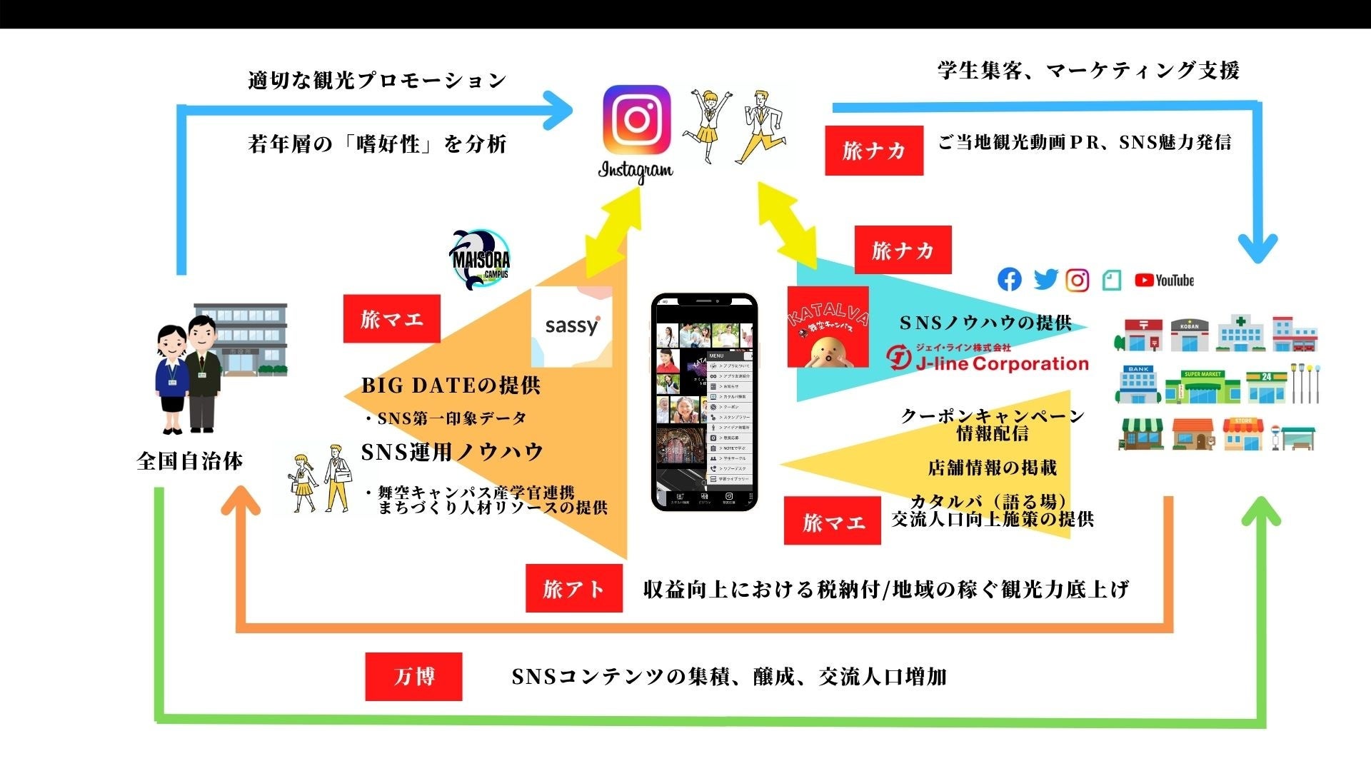 地域活性と次世代のリーダー⼈材育成をテーマにする全国の学⽣コミュニティ 舞空キャンパス、株式会社RelyonTrip、ジェイ・ライン株式会社ならびにSDGs products株式会社は、『地域魅⼒発掘型若年層旅⾏最先端モデル事業』を実施することを決定しました。2025年⼤阪・関西万博を前に⾼まる旅⾏需要をチャンスと捉え、検索エンジン化されたSNSの中で蓄積されるビッグデータから、今から若年層に確実に訴求できるSNS運⽤法を基に、若年層を全国各地域へ誘客し、持続的に地域活性化を⽬指す事業です。