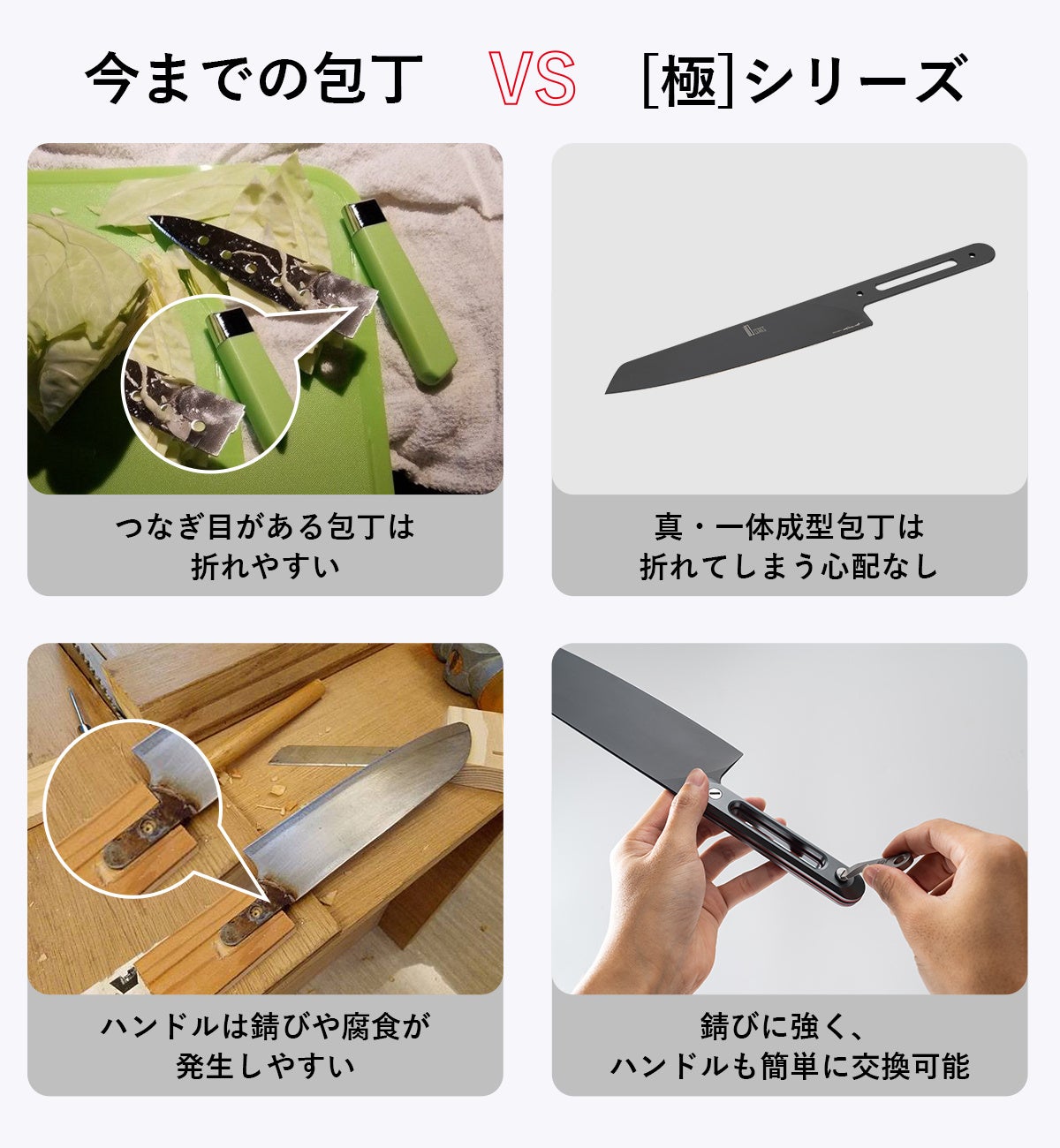 従来の包丁はハンドルを自由に交換できないため、優れた切れ味を持っていても、ハンドルが壊れると本体まで捨てらなければなりませんでした。「極」は、専用のパーツで誰でも簡単に交換できるため、包丁の廃棄問題を解決できます。