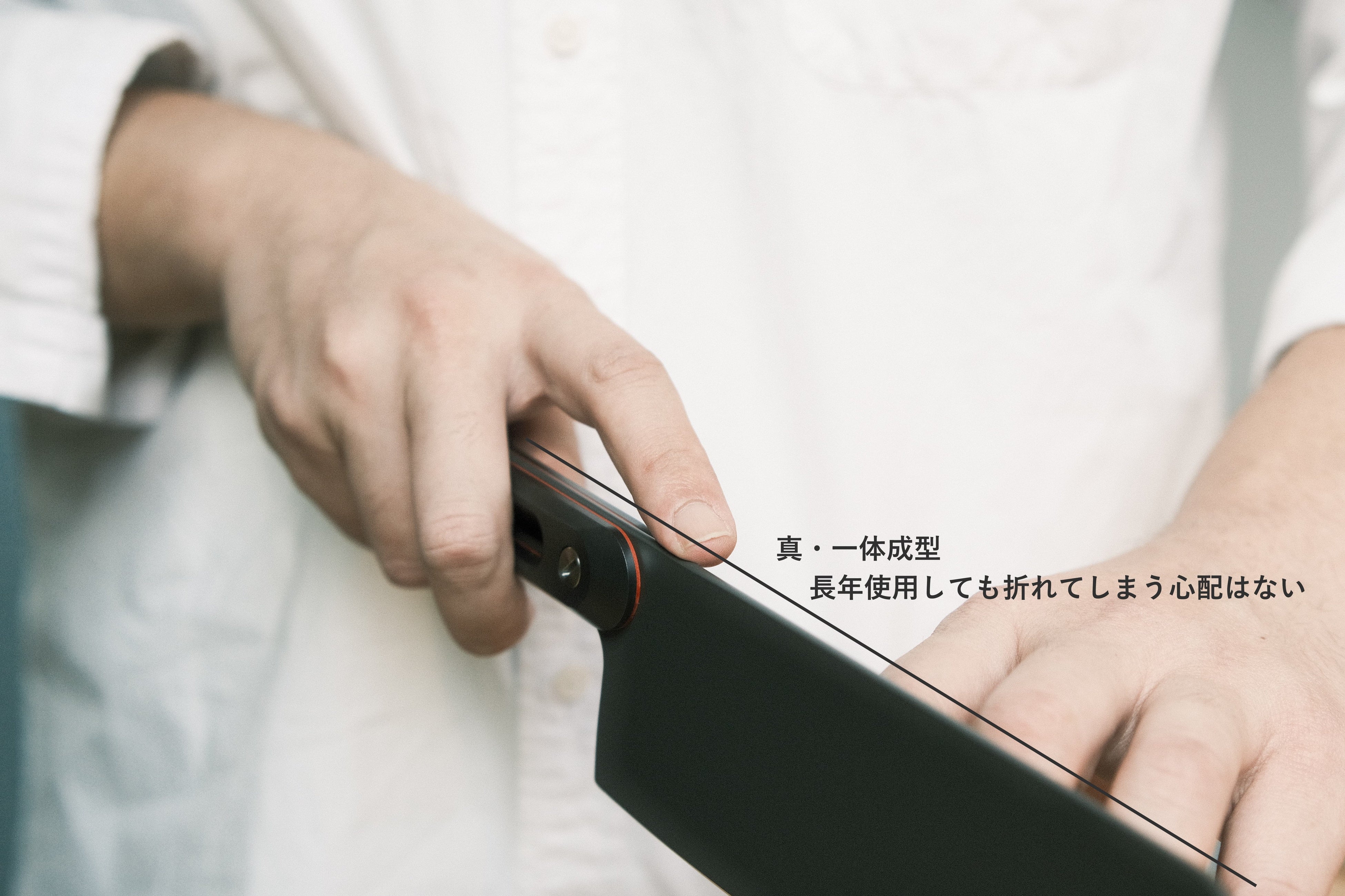 柄から刃まで一体成型のデザインと、組み立て式のハンドルで重心を完璧まで調整。男女問わず持ちやすいパーフェクトなバランスを実現しました。しかも一般的な一体型包丁と違い、溶接によるつなぎ目がないため、より丈夫で長く使い続けることが可能です。