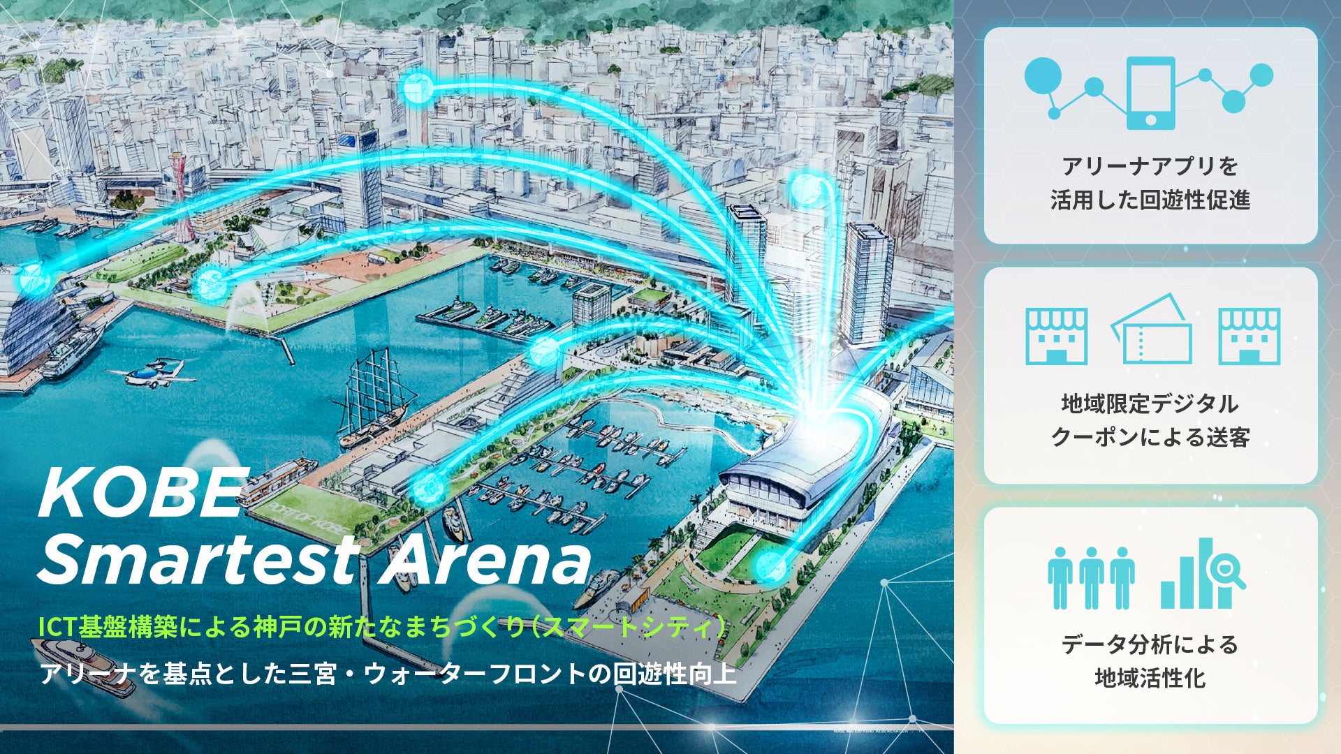 アリーナアプリを活用し、来場者の利便性向上やフルキャッシュレス、スマホチケットの機能を提供すると共に、環境負荷低減への貢献アクションによって地域で活用できるデジタルクーポンを付与するなど、周辺地域とも連携する形で回遊性向上や観光しやすい仕組み作りなどを実装します。港都神戸を象徴する三宮・ウォーターフロントエリアから、スマートシティへの取り組みへと進展させていく予定です。