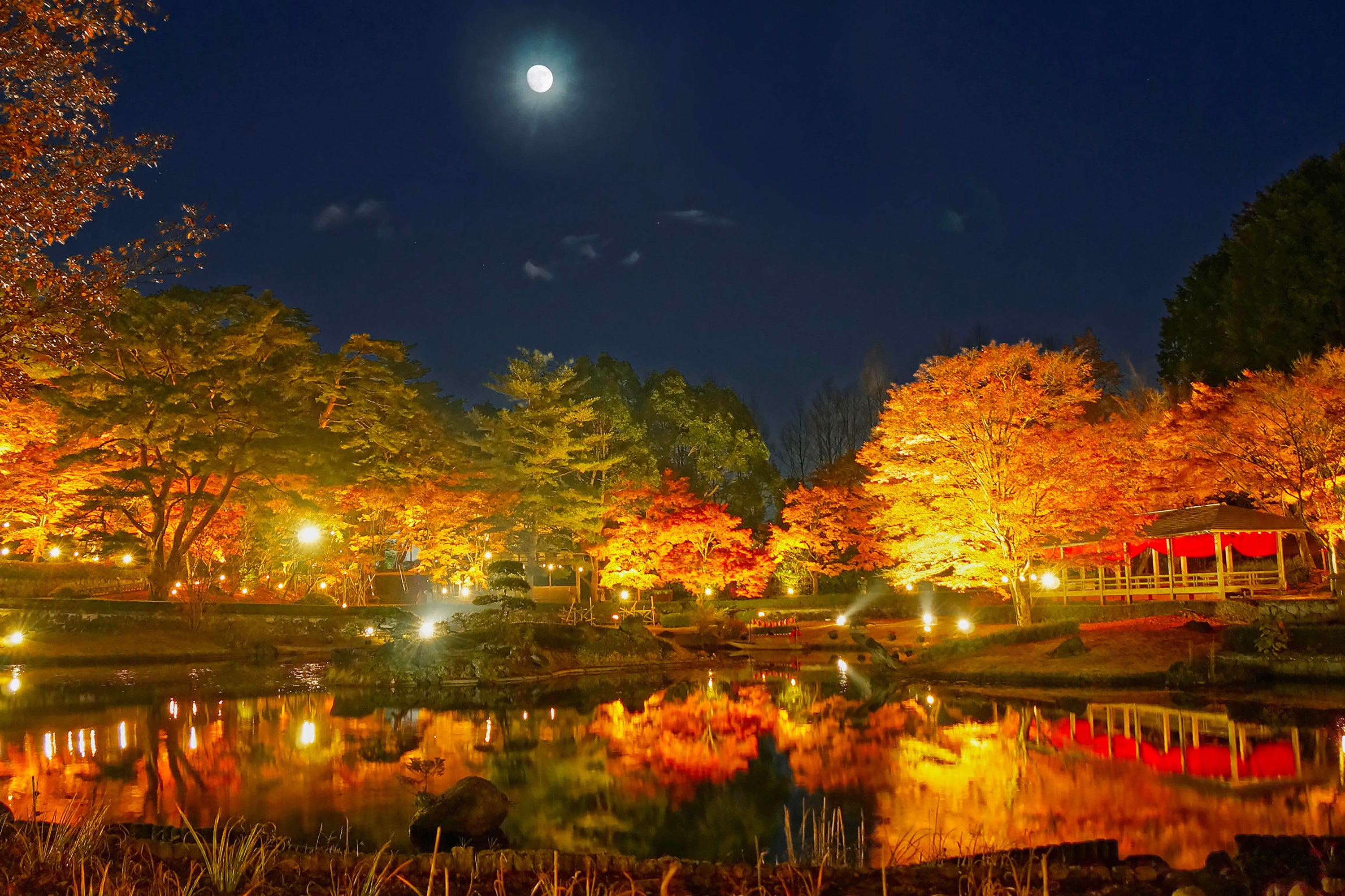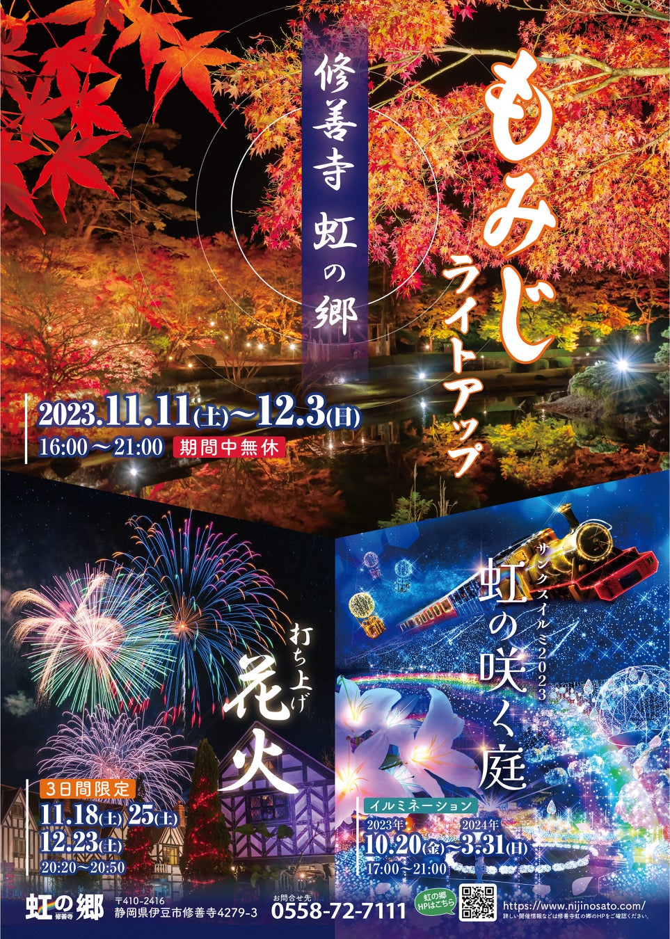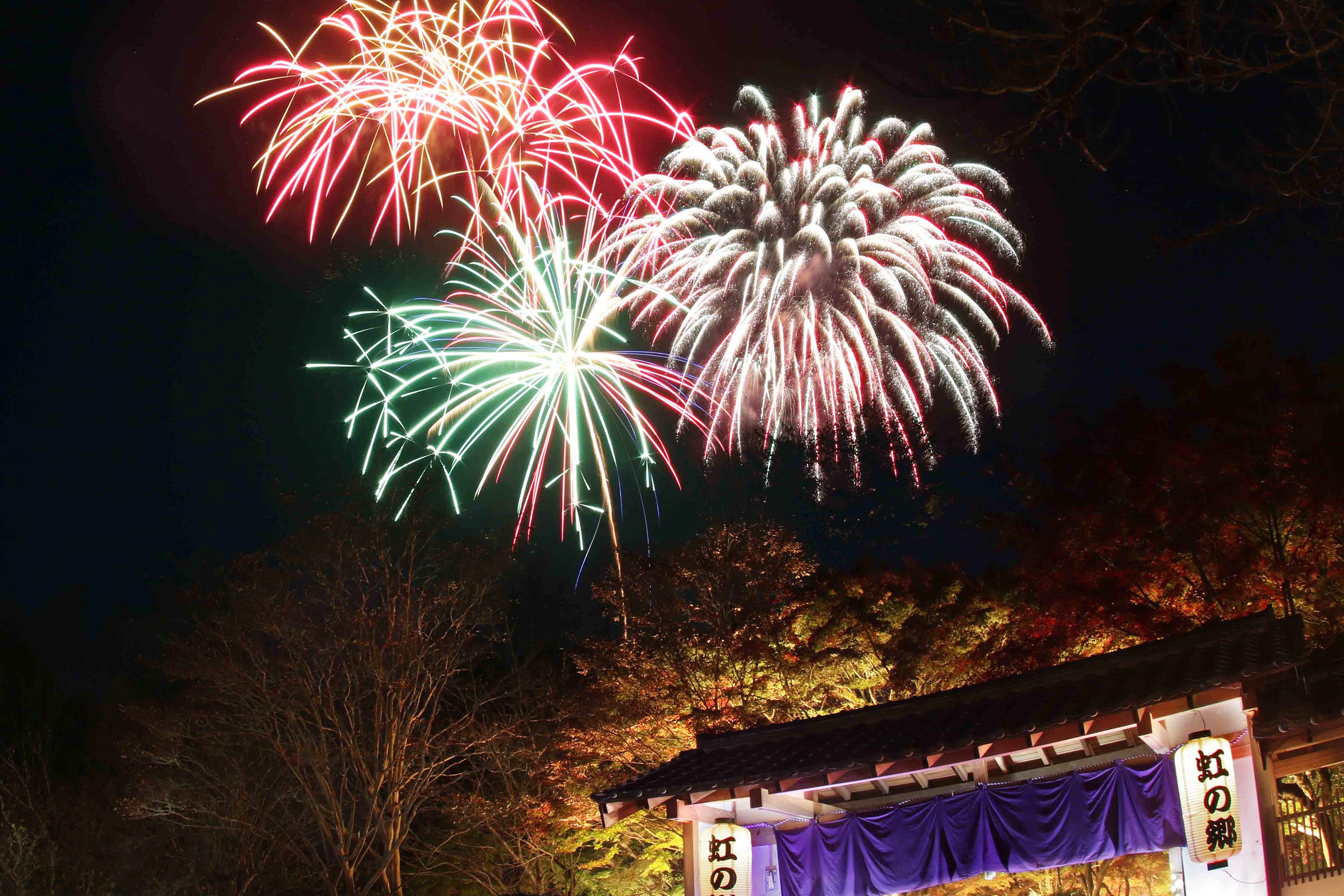 【伊豆の紅葉】修善寺虹の郷、夜空を彩る『もみじライトアップ』&『秋の打ち上げ花火』を開催 11月11日(土)から