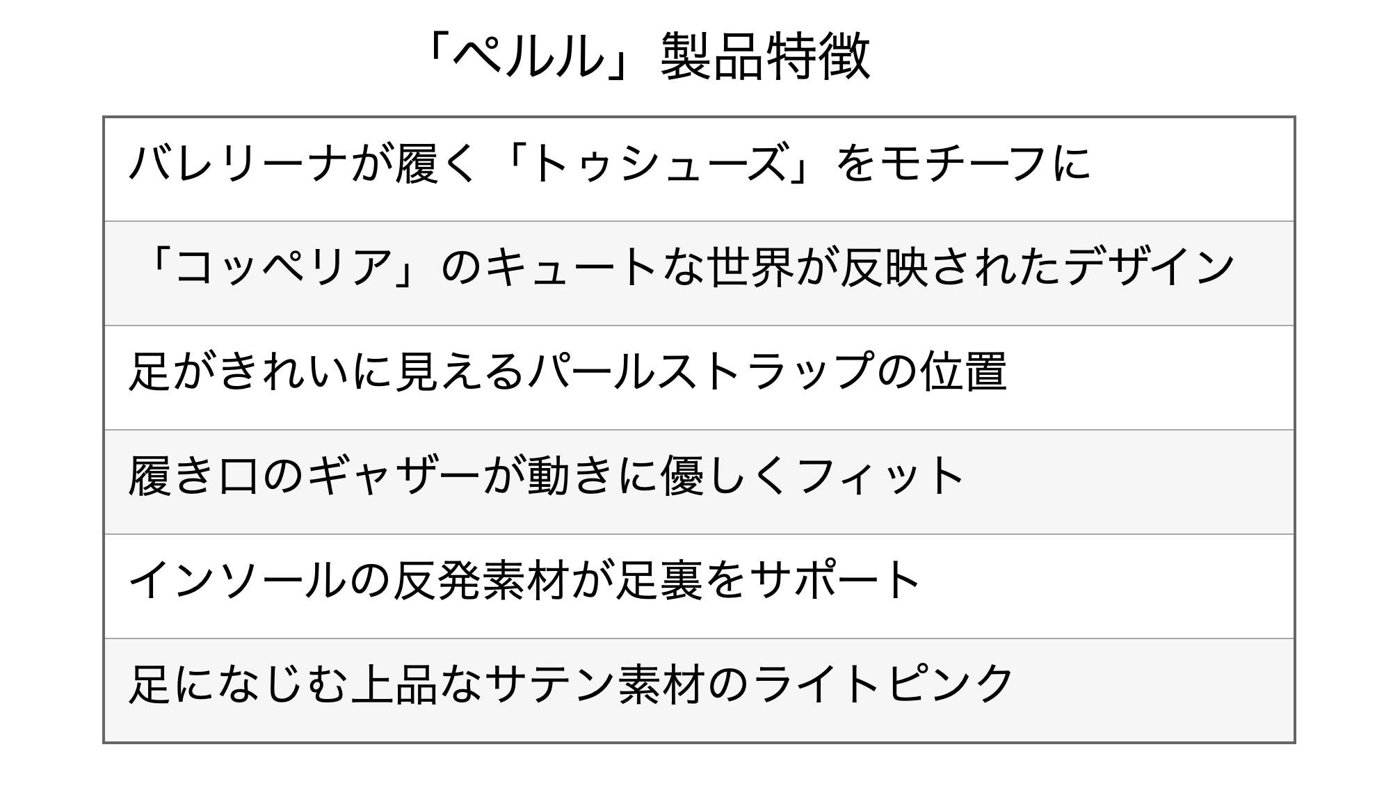 今回のコラボシューズのデザイン・モデルは、貞松・浜田バレエ団から、ダンサーのシャンティ紀奈が務めました。現役のバレリーナが「今回バレエ団が上演する『コッペリア』とともにおしゃれも楽しんでほしい」と、コラボシューズが完成しました。商品名は「ペルル」(フランス語で「パール」の意)と命名され、ずらりと並んだパールの華やかさが、バレエ公演鑑賞時にもぴったりの一足です。