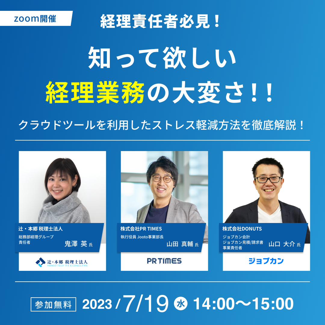 【7/19開催】辻・本郷 ITコンサルティング、DONUTS・PR TIMESとの共催セミナー『知って欲しい!経理業務の大変さ!!クラウドツールを利用したストレス軽減方法を徹底解説』を開催
